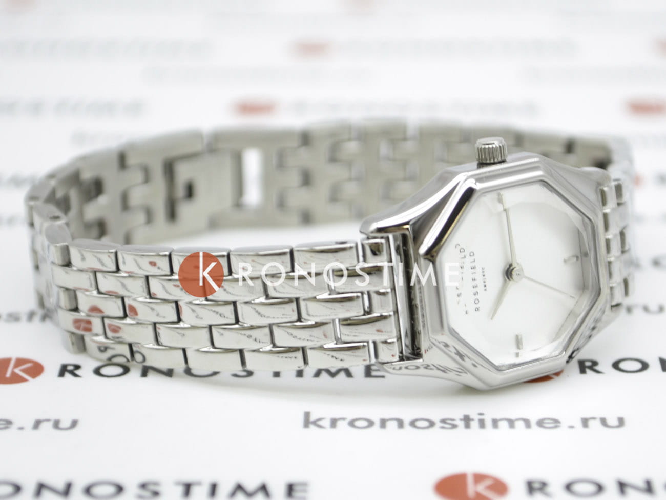 Женские кварцевые часы. Центральные часовая, минутная и секундная стрелки. Белый циферблат. Восьмиугольный корпус выполнен из полированной нержавеющей стали. Размер корпуса составляет 21,5 х 27,5 мм. Стальной браслет c ювелирной застежкой. Прочное минеральное стеклоМинеральное стеклоМинеральное стекло представляет собой искусственно выращенный минерал кварца. Такое стекло отличается особой устойчивостью к повреждениям и царапинам. Уступает по некоторым качествам сапфировому стеклу. устойчивое к мелким механическим повреждениям. Водостойкость WR 30 (брызги).