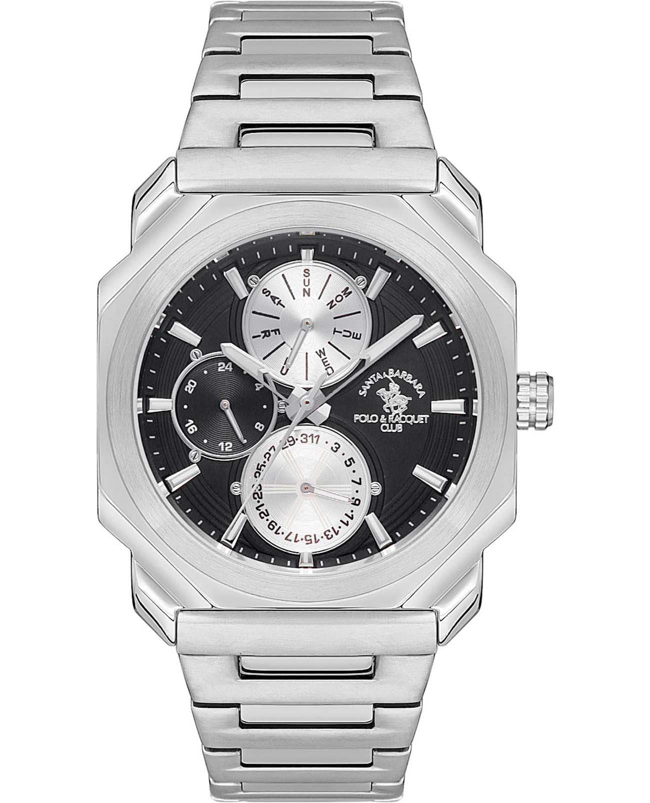 Мужские кварцевые часы Santa Barbara Polo & Racquet Club — это стильный и практичный аксессуар для повседневного ношения. Корпус необычной формы диаметром 42 мм выполнен из стали с матовой и полированной отделкой. Циферблат чёрного цвета оформлен в виде концентрических кругов и дополнен фирменным логотипом. Накладные метки в виде штрихов, стрелки прямоугольные, заострённые, в стиле Baton. Указатели дня недели и даты вынесены на отдельные субциферблаты, также присутствует индикация 24-часового формата времени. Стрелки и метки с люминесцентным покрытиемЛюминесцентное покрытиеПозволяет считывать показания времени в темноте. Производители наносят на стрелки, часовые индексы, безель или поверхность циферблата светонакопительный состав, дающий холодное свечение., обеспечивающим хорошую читаемость в темноте. Циферблат защищён минеральным стекломМинеральное стеклоМинеральное стекло представляет собой искусственно выращенный минерал кварца. Такое стекло отличается особой устойчивостью к повреждениям и царапинам. Уступает по некоторым качествам сапфировому стеклу.. Механизм — кварцевый. Часы оснащены стальным браслетом с раскладной застёжкойРаскладная застёжкаТакой тип застёжки используется только на браслетах из металла. Она никогда не раскрывается полностью, происходит разделение на 2 и более частей. Раскладывающая застёжка снизит вероятность потери часов к минимуму.. Водонепроницаемость 50 м позволяет использовать часы в повседневных условиях. Идеальный выбор для тех, кто ценит функциональность, стиль и качество.