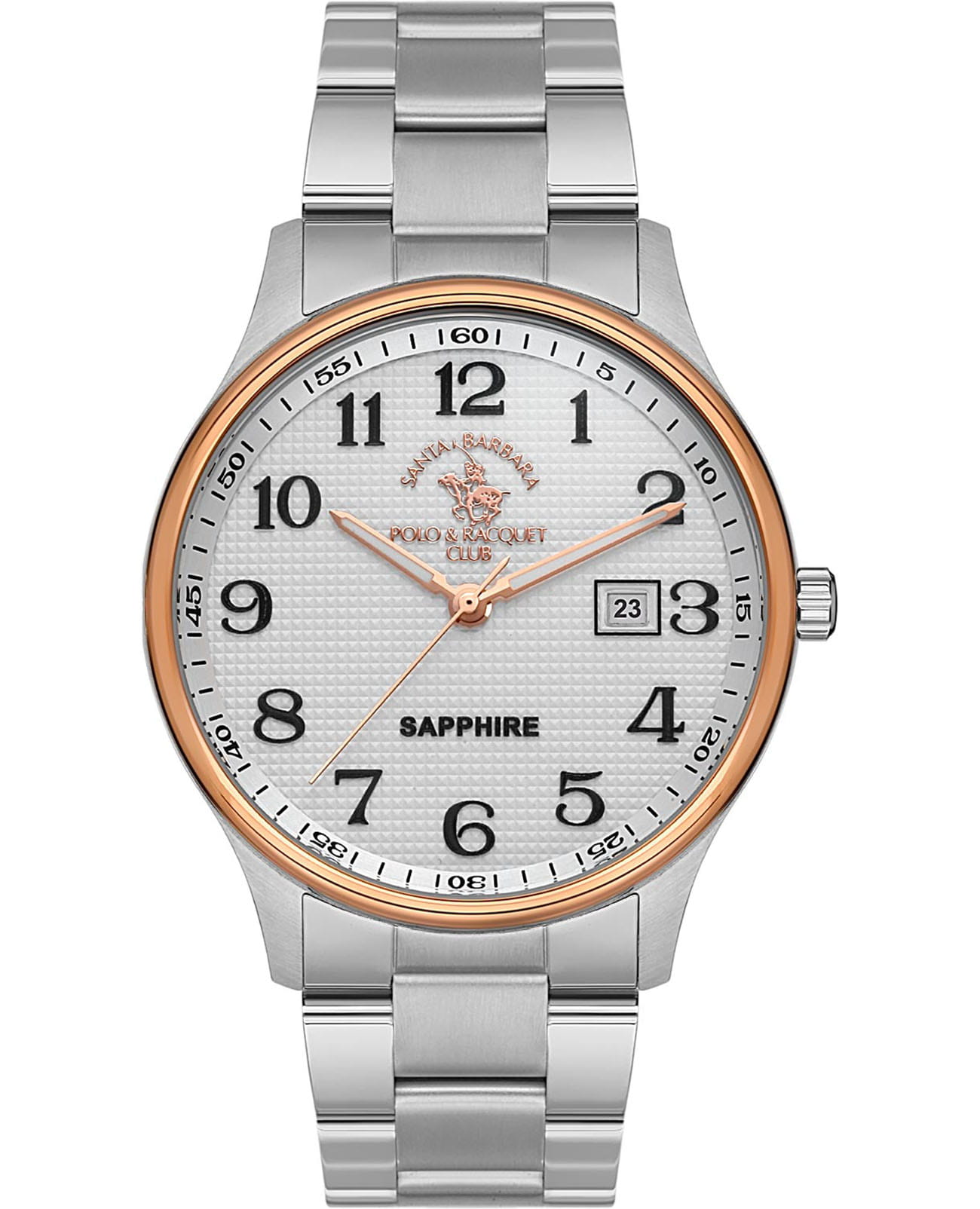Мужские кварцевые часы Santa Barbara Polo & Racquet Club — это гармония изящества и классики. Корпус диаметром 43 мм и высотой 51,5 мм выполнен из стали. БезельБезельВнешний ободок, закрепляющий стекло. В спортивных часах так называется поворотное кольцо с делениями на циферблате, выполняет роль таймера – замеряет отрезки времени на шкале. Неподвижный безель – элемент декора. Однонаправленно вращающийся безель на дайверских часах позволяет фиксировать моменты погружения и выныривания на поверхность. с частичным IP-покрытиемIP-покрытиеМетод ионного напыления. Демонстрирует повышенную устойчивость к истиранию, окислению и химическим веществам. Под воздействием высокого давления и температуры около 1500°C молекулы металла надёжно соединяются с частицами корпуса часов. розового золота. Циферблат белого цвета украшен узором Clous de Paris и фирменным логотипом. Накладные метки в виде арабских цифр придают дизайну выразительность. Окошко даты расположено в положении 3 часов. Стрелки с люминесцентным покрытиемЛюминесцентное покрытиеПозволяет считывать показания времени в темноте. Производители наносят на стрелки, часовые индексы, безель или поверхность циферблата светонакопительный состав, дающий холодное свечение., обеспечивающим хорошую читаемость в темноте. Циферблат защищён минеральным стеклом с сапфировым покрытиемСапфировое стеклоПрочный и надёжный материал из кристалла сапфира синтетического происхождения, характеризующийся особой твёрдостью и устойчивостью к царапинам и повреждениям.. Часы оснащены стальным браслетом с раскладной застёжкойРаскладная застёжкаТакой тип застёжки используется только на браслетах из металла. Она никогда не раскрывается полностью, происходит разделение на 2 и более частей. Раскладывающая застёжка снизит вероятность потери часов к минимуму.. Водонепроницаемость 50 м позволяет использовать часы в повседневных условиях. Идеальный выбор для тех, кто ценит стабильность, успех и элегантный стиль.