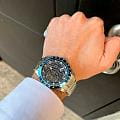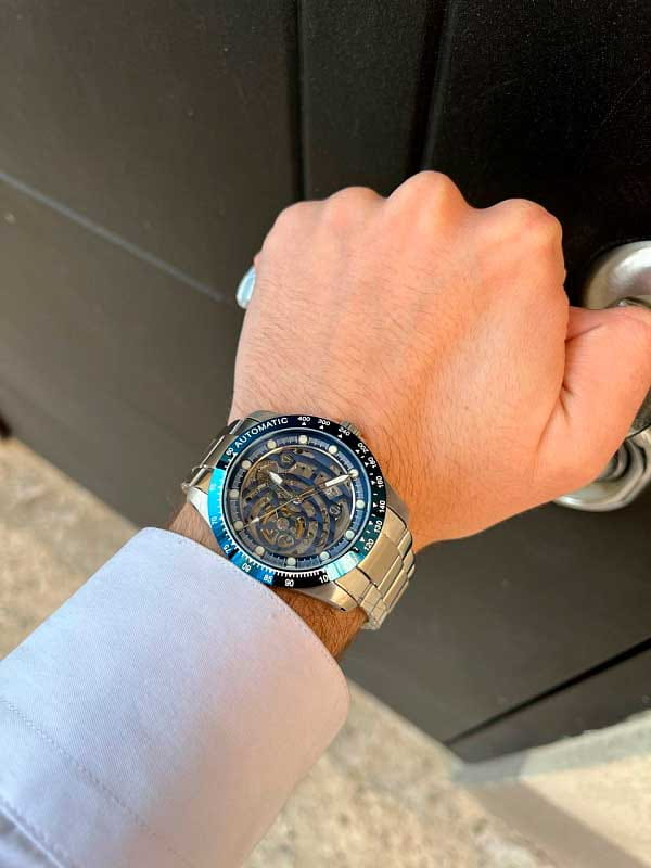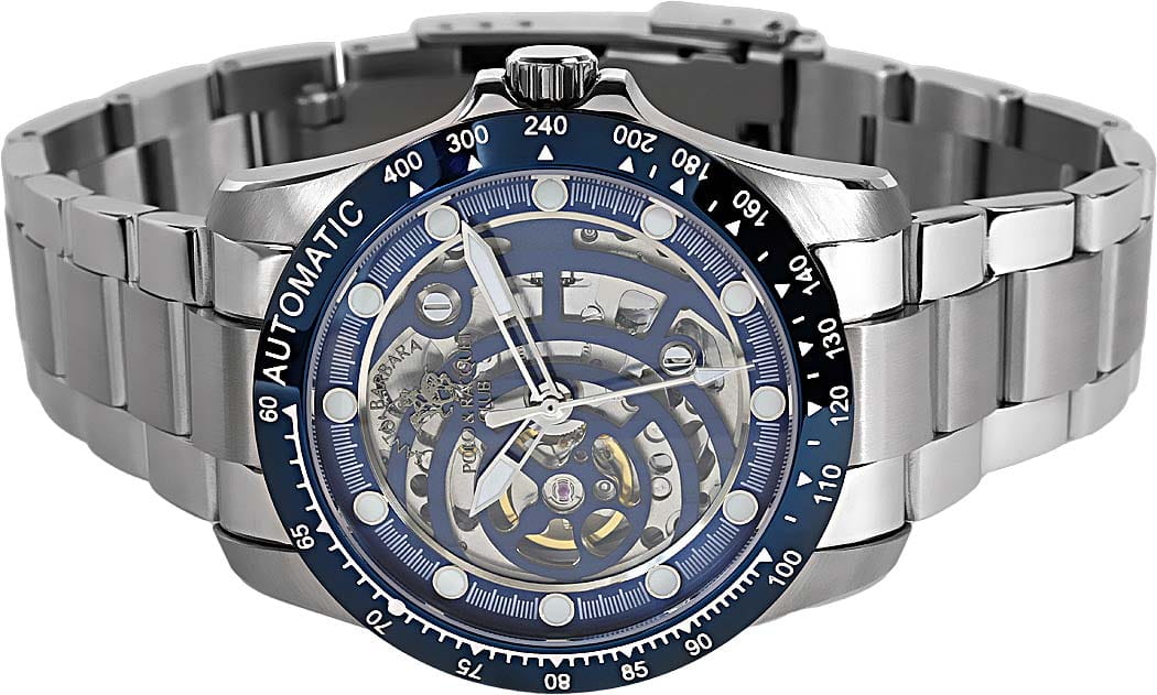 Мужские механические часы с автоподзаводом Santa Barbara Polo & Racquet Club — это эффектный аксессуар с оригинальным дизайном. Корпус диаметром 42 мм и высотой 49,5 мм выполнен из стали. БезельБезельВнешний ободок, закрепляющий стекло. В спортивных часах так называется поворотное кольцо с делениями на циферблате, выполняет роль таймера – замеряет отрезки времени на шкале. Неподвижный безель – элемент декора. Однонаправленно вращающийся безель на дайверских часах позволяет фиксировать моменты погружения и выныривания на поверхность. из стали с IP-покрытиемIP-покрытиеМетод ионного напыления. Демонстрирует повышенную устойчивость к истиранию, окислению и химическим веществам. Под воздействием высокого давления и температуры около 1500°C молекулы металла надёжно соединяются с частицами корпуса часов.. Циферблат синего цвета частично скелетонизирован, что позволяет наблюдать за работой механизма. Двухуровневый циферблат украшен накладными метками в виде точек и фирменным логотипом. Стрелки и метки с люминесцентным покрытиемЛюминесцентное покрытиеПозволяет считывать показания времени в темноте. Производители наносят на стрелки, часовые индексы, безель или поверхность циферблата светонакопительный состав, дающий холодное свечение., обеспечивающим хорошую читаемость в темноте. Циферблат защищён минеральным стекломМинеральное стеклоМинеральное стекло представляет собой искусственно выращенный минерал кварца. Такое стекло отличается особой устойчивостью к повреждениям и царапинам. Уступает по некоторым качествам сапфировому стеклу.. Прозрачная задняя крышка открывает вид на механизм. Часы оснащены стальным браслетом с раскладной застёжкойРаскладная застёжкаТакой тип застёжки используется только на браслетах из металла. Она никогда не раскрывается полностью, происходит разделение на 2 и более частей. Раскладывающая застёжка снизит вероятность потери часов к минимуму.. Водонепроницаемость 50 м позволяет использовать часы в повседневных условиях. Идеальный выбор для тех, кто ценит технологичность, стиль и выразительность.