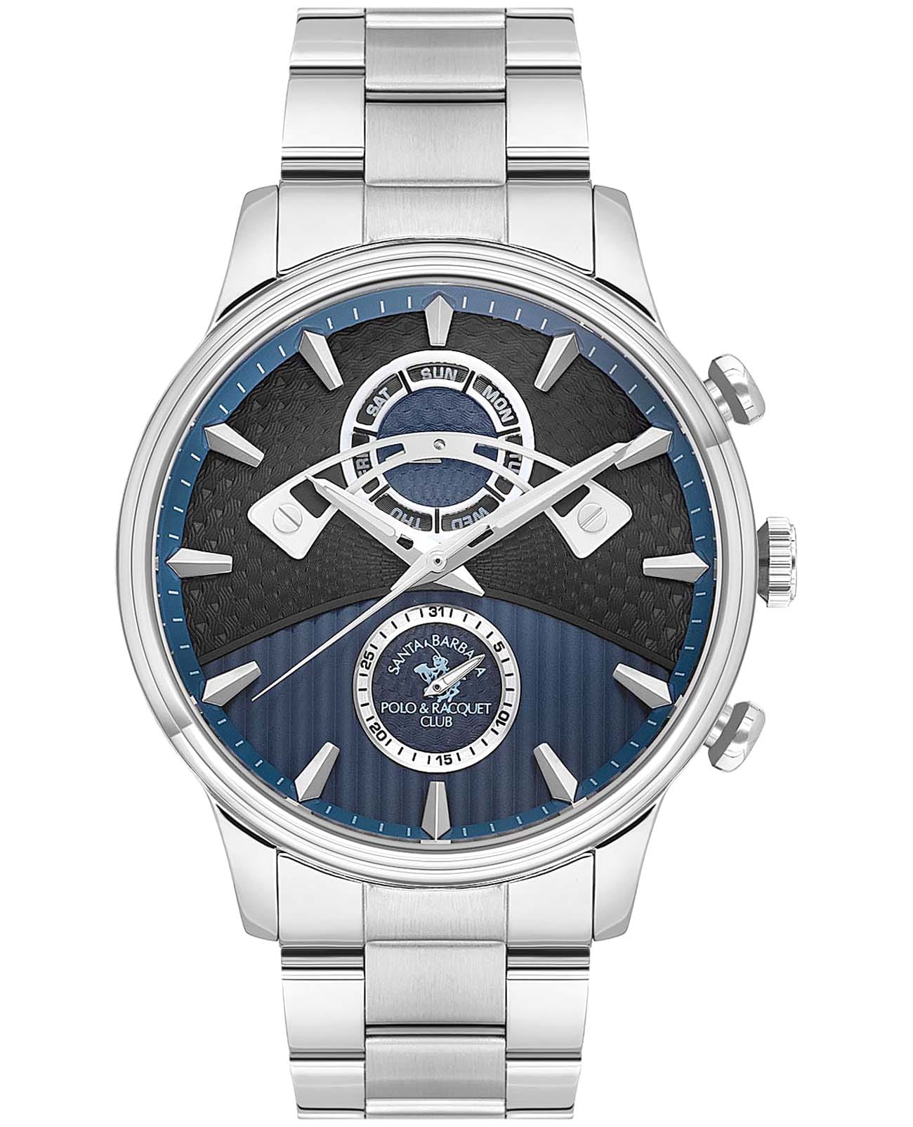 Мужские кварцевые часы Santa Barbara Polo & Racquet Club SB.1.10592-5 — воплощение элегантности и технического совершенства. Корпус из нержавеющей стали серебристого цвета, диаметром 45 мм, что делает их устойчивыми к внешним воздействиям и придает благородный вид. Стрелки с люминесцентным покрытиемЛюминесцентное покрытиеПозволяет считывать показания времени в темноте. Производители наносят на стрелки, часовые индексы, безель или поверхность циферблата светонакопительный состав, дающий холодное свечение., обеспечивающим хорошую читаемость в темноте. Циферблат защищён минеральным стекломМинеральное стеклоМинеральное стекло представляет собой искусственно выращенный минерал кварца. Такое стекло отличается особой устойчивостью к повреждениям и царапинам. Уступает по некоторым качествам сапфировому стеклу. устойчивое к царапинам и механическим повреждениям. Циферблат разделен на две фактурные части и украшен фирменным логотипом. Дата и день недели вынесены на отдельные циферблаты. Стальной браслет на раскладной застёжкеРаскладная застёжкаТакой тип застёжки используется только на браслетах из металла. Она никогда не раскрывается полностью, происходит разделение на 2 и более частей. Раскладывающая застёжка снизит вероятность потери часов к минимуму. обеспечивает комфортное и безопасное ношение. Водонепроницаемость 50 метров позволит защитить корпус от случайных брызг или капель дождя. Идеальный выбор для тех, кто ценит элегантный дизайн и качество.