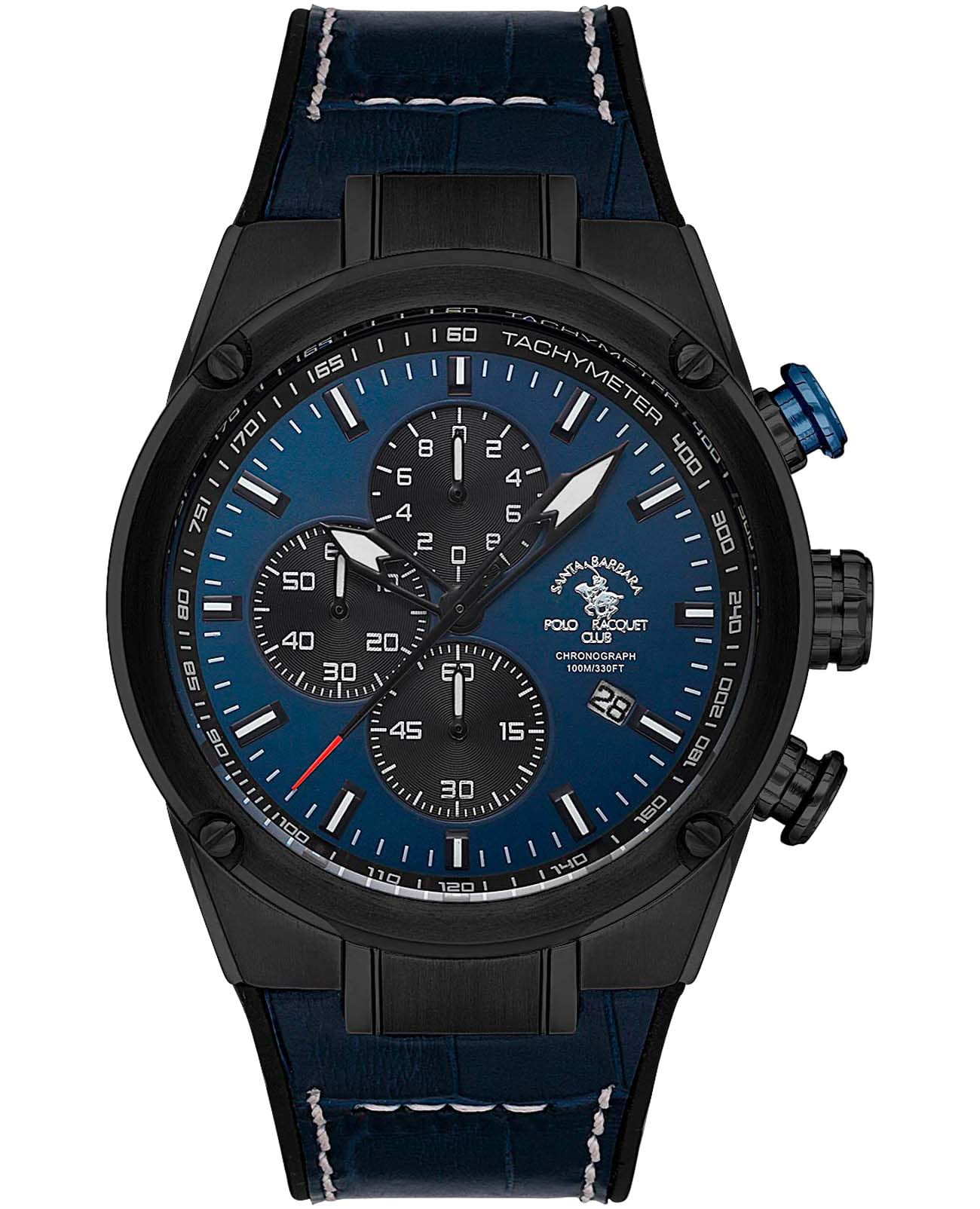 Мужские кварцевые часы-хронографХронографФункция позволяет измерять отрезки времени с особой точностью: часы, минуты, секунды. Верным признаком хронографа является наличие на циферблате 3 дополнительных окошек-счётчиков. с секундомеромСекундомерСекундоме́р — прибор, способный измерять интервалы времени с точностью до долей секунды. Santa Barbara Polo & Racquet Club SB.3.10001-3 — воплощение элегантности и технического совершенства. Корпус из нержавеющей стали с IP-покрытиемIP-покрытиеМетод ионного напыления. Демонстрирует повышенную устойчивость к истиранию, окислению и химическим веществам. Под воздействием высокого давления и температуры около 1500°C молекулы металла надёжно соединяются с частицами корпуса часов. черного цвета, диаметром 45 мм, что делает их устойчивыми к внешним воздействиям и придает благородный вид. Стрелки и метки с люминесцентным покрытиемЛюминесцентное покрытиеПозволяет считывать показания времени в темноте. Производители наносят на стрелки, часовые индексы, безель или поверхность циферблата светонакопительный состав, дающий холодное свечение., обеспечивающим хорошую читаемость в темноте. Циферблат защищён минеральным стекломМинеральное стеклоМинеральное стекло представляет собой искусственно выращенный минерал кварца. Такое стекло отличается особой устойчивостью к повреждениям и царапинам. Уступает по некоторым качествам сапфировому стеклу. устойчивое к царапинам и механическим повреждениям. Окошко даты находится в положении 4 часа, тахиметрТахиметрРазмеченная шкала, располагается на ободке или безеле часов. Тахиметр позволяет рассчитать скорость на определённом участке пути, расстояние измеряется в километрах или милях. по внешнему краю. Кожаный ремешок на стандартной застёжке обеспечивает комфортное и безопасное ношение. Водонепроницаемость 100 метров позволит плавать, нырять и заниматься другими водными видами спорта. Идеальный выбор для тех, кто ценит элегантный дизайн и качество.