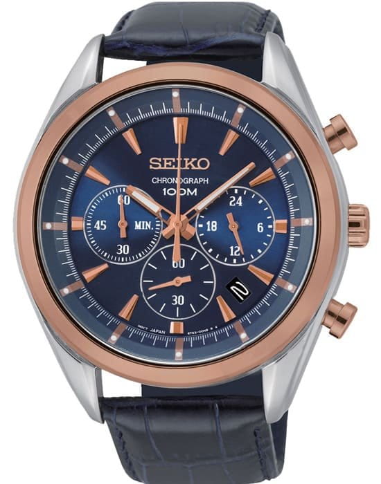 Мужские кварцевые наручные часы с хронографом (секундомером) Seiko SSB160P1 коллекции CS Sports. Калибр механизма — 6T63. Максимально допустимая погрешность точности хода +15/-15 секунд в месяц. Секундомер может отсчитывать до 60 минут с шагом 1/5 секунды. На данной модели отображается дата. Стрелки и метки покрыты люминесцентным напылением LumiBright (светятся в темноте). Установлено минеральное стекло повышенной прочности Hardlex Crystal. Ремешок — телячья кожа. Завинчивающаяся задняя крышка часов. Водонепроницаемость WR100 (10 атм). На корпус данной модели частично нанесено PVD покрытие.