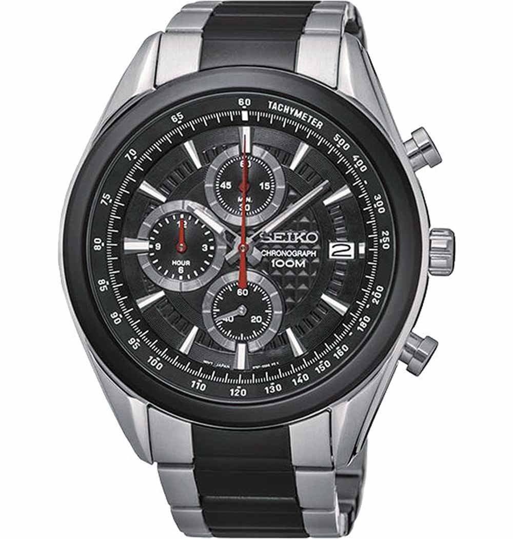 Часы-хронограф с секундомером и тахиметром. Секундомер до 12ч, точность 1/5с. Завинчивающаяся задняя крышка. Браслет с раскладывающейся застежкой. Застежка с системой блокировки.
