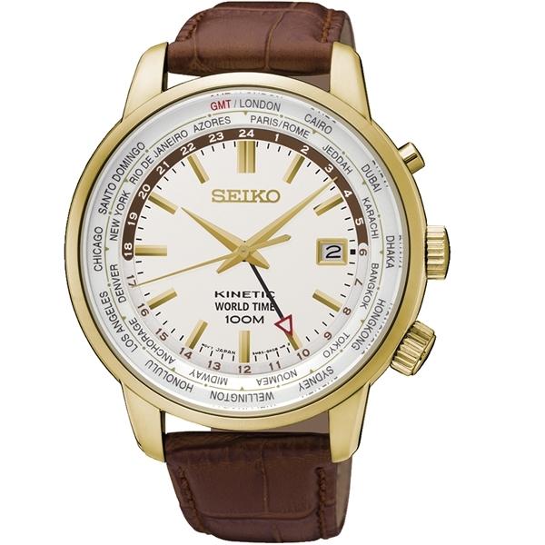 Успешные люди, желающие идти в ногу со временем, выбирают инновационные и надежные часы марки Seiko. Механизм Seiko Kinetic. Круглый корпус часов выполнен из  высокопрочной стали с антикоррозийными свойствами с полным PVD покрытием. Белый фон циферблата и золотые элементы дизайна. Водонепроницаемость 10 ATM. Минеральное стекло Hardlex, устойчивое к появлению царапин. Часы оснащены вторым часовым поясом  в 24х часовом формате и мировым временем. Ремешок выполнен из натуральной кожи коричневого цвета с раскладывающейся застежкой.