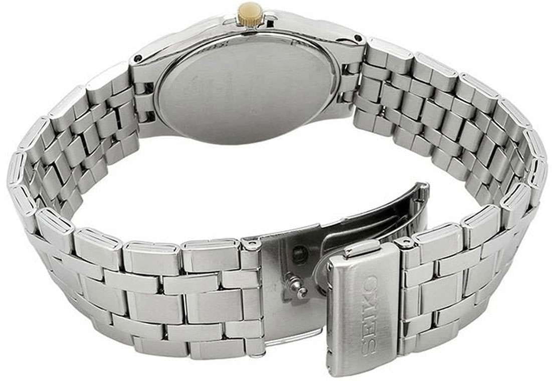 Мужские кварцевые часы Seiko — это надёжный и универсальный аксессуар. Корпус диаметром 34 мм выполнен из нержавеющей стали 316L. Циферблат оформлен индексами и стрелками, включая центральную секундную стрелку. Циферблат защищён прочным закалённым минеральным стеклом Hardlex минеральным стекломМинеральное стеклоМинеральное стекло представляет собой искусственно выращенный минерал кварца. Такое стекло отличается особой устойчивостью к повреждениям и царапинам. Уступает по некоторым качествам сапфировому стеклу.. Механизм — калибр 7N01 с высокой точностью хода (±10–15 сек. в месяц). Часы оснащены стальным браслетом на тройной раскладной застёжкеРаскладная застёжкаТакой тип застёжки используется только на браслетах из металла. Она никогда не раскрывается полностью, происходит разделение на 2 и более частей. Раскладывающая застёжка снизит вероятность потери часов к минимуму. с фиксатором. Водонепроницаемость 50 м позволяет использовать часы в повседневных условиях. Идеальный выбор для тех, кто ценит японское качество и классический дизайн.