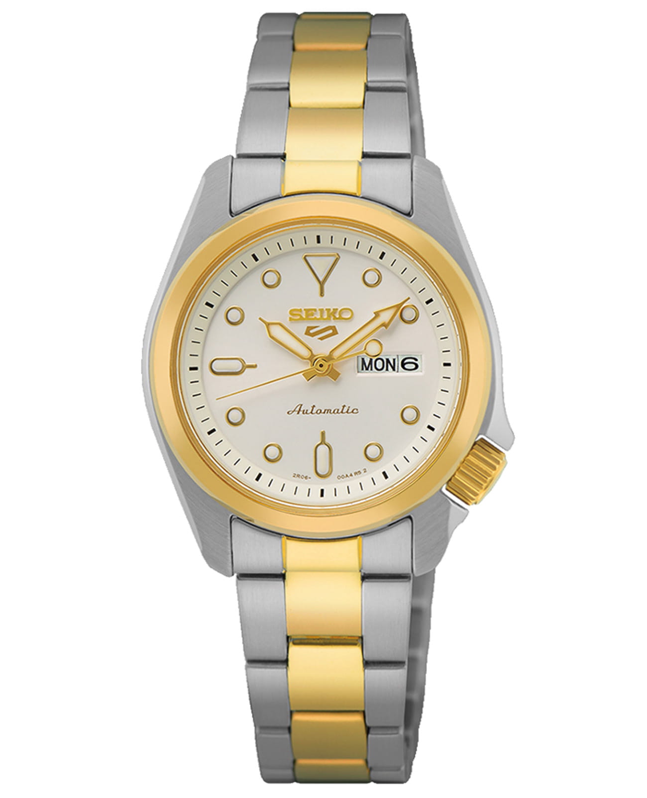 Механические часы Seiko SRE004K1 из коллекции 5 Sports — это лёгкий и практичный аксессуар, сочетающий в себе функциональность и изысканный дизайн. Модель оснащена калибром 2R06 с автоподзаводом и возможностью ручной подзаводки. Механизм имеет 21 драгоценный камень и обеспечивает запас хода до 40 часов. Также реализована функция стоп-секунды для точной установки времени и защита от магнитных полей до 4800 А/м. Циферблат белого цвета выполнен по технологии Sunray, имитирующей солнечные лучи. Метки представлены в виде штрихов и точек, а стрелки и индексы покрыты фирменным люминесцентным составомЛюминесцентное покрытиеПозволяет считывать показания времени в темноте. Производители наносят на стрелки, часовые индексы, безель или поверхность циферблата светонакопительный состав, дающий холодное свечение. LumiBrite, обеспечивающим отличную читаемость даже в темноте. Окошко календаря с отображением дня недели и даты расположено в положении 3 часов, что делает его легко читаемым в любых условиях. Защиту циферблата обеспечивает минеральное стеклоМинеральное стеклоМинеральное стекло представляет собой искусственно выращенный минерал кварца. Такое стекло отличается особой устойчивостью к повреждениям и царапинам. Уступает по некоторым качествам сапфировому стеклу. повышенной прочности Hardlex. Заводная головка с защитой расположена в положении 4 часов, что повышает комфорт при использовании. Задняя крышка — завинчивающаяся, что обеспечивает дополнительную защиту механизма. Корпус диаметром 28 мм изготовлен из стали с частичным PVD-покрытиемPVDУльтратонкое покрытие наносится в технике вакуумного напыления, сочетает в себе нитрид титана особой прочности со слоем золота или оксида хрома. Несёт в себе декоративную или защитную функцию., придающим модели благородный внешний вид. Браслет выполнен из стали с частичным покрытием и оснащён раскладной застёжкойРаскладная застёжкаТакой тип застёжки используется только на браслетах из металла. Она никогда не раскрывается полностью, происходит разделение на 2 и более частей. Раскладывающая застёжка снизит вероятность потери часов к минимуму., обеспечивающей комфорт и уверенную фиксацию на запястье. Расстояние между ушками составляет 14 мм, что делает модель совместимой с различными типами браслетов. Часы водонепроницаемы до 100 метров (), что позволяет использовать их при плавании и других водных активностях. Эти часы станут универсальным аксессуаром для тех, кто ценит сочетание технологичности, прочности и эстетики — идеальный выбор как для повседневного использования, так и для делового образа.
