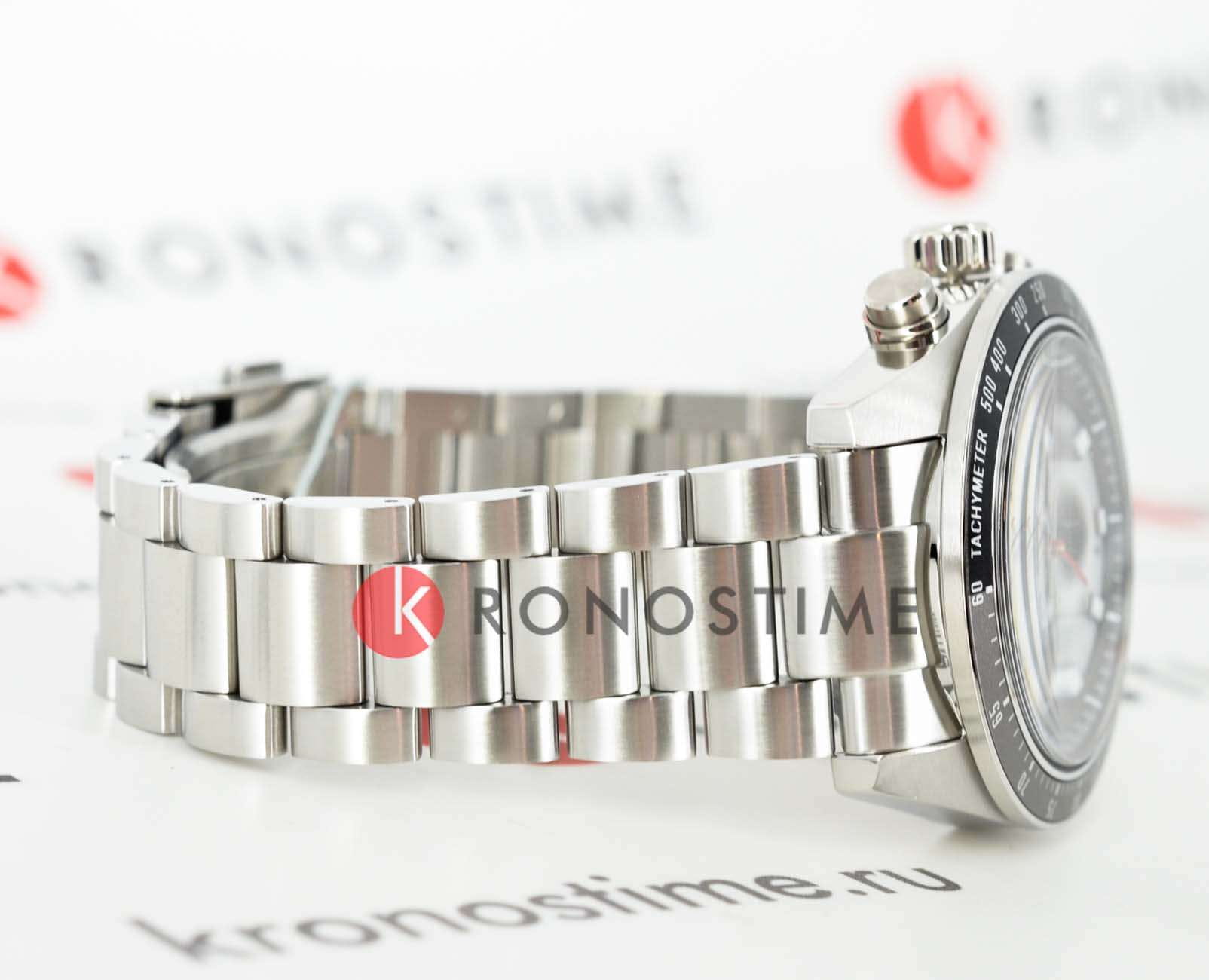 Фиксированный алюминиевый тахиметрический безельТахиметрРазмеченная шкала, располагается на ободке или безеле часов. Тахиметр позволяет рассчитать скорость на определённом участке пути, расстояние измеряется в километрах или милях. позволяет измерять скорость по пройденному расстоянию. Серебристый, солнечного финиша циферблат украшен тремя чёрными счётчиками: малого секундомерного, хронографа и 24-часового. Стрелки хронографа — красные, для удобства считывания, а часовые метки и стрелки покрыты люминесцентным покрытиемЛюминесцентное покрытиеПозволяет считывать показания времени в темноте. Производители наносят на стрелки, часовые индексы, безель или поверхность циферблата светонакопительный состав, дающий холодное свечение. LumiBrite, что обеспечивает отличную видимость в условиях слабого света.