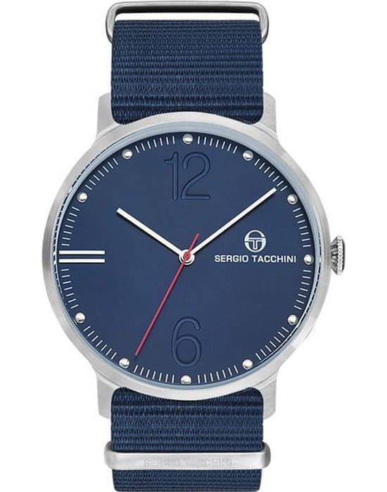 Sergio Tacchini — стильные мужские часы в минималистичном дизайне, подчеркивающем лёгкость и современность образа. Круглый корпус выполнен из нержавеющей стали, а циферблат оформлен крупными арабскими цифрами «6» и «12» и тонкими метками, что делает показания лёгкими для восприятия.