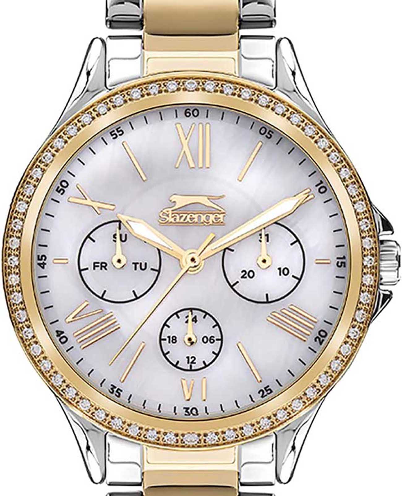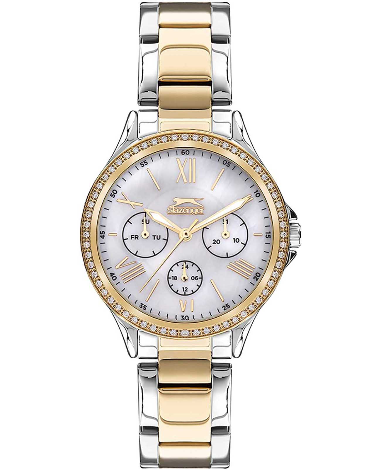 Slazenger SL.09.2021.4.04 – элегантные женские часы, сочетающие стильный дизайн и функциональность. Корпус выполнен из суперметалла, придающим модели роскошный внешний вид. Перламутровый циферблат добавляет изысканности, и защищён минеральным стекломМинеральное стеклоМинеральное стекло представляет собой искусственно выращенный минерал кварца. Такое стекло отличается особой устойчивостью к повреждениям и царапинам. Уступает по некоторым качествам сапфировому стеклу., устойчивым к царапинам. БезельБезельВнешний ободок, закрепляющий стекло. В спортивных часах так называется поворотное кольцо с делениями на циферблате, выполняет роль таймера – замеряет отрезки времени на шкале. Неподвижный безель – элемент декора. Однонаправленно вращающийся безель на дайверских часах позволяет фиксировать моменты погружения и выныривания на поверхность. с PVD-покрытиемPVDУльтратонкое покрытие наносится в технике вакуумного напыления, сочетает в себе нитрид титана особой прочности со слоем золота или оксида хрома. Несёт в себе декоративную или защитную функцию. украшен кристаллами. Часы оснащены точным кварцевым механизмом, обеспечивающим надёжное и стабильное отображение времени. Дополнительные функции включают индикацию дня недели и даты, что повышает практичность использования. Браслет из суперметалла с PVD-покрытиемPVDУльтратонкое покрытие наносится в технике вакуумного напыления, сочетает в себе нитрид титана особой прочности со слоем золота или оксида хрома. Несёт в себе декоративную или защитную функцию. оснащён раскладной застёжкойРаскладная застёжкаТакой тип застёжки используется только на браслетах из металла. Она никогда не раскрывается полностью, происходит разделение на 2 и более частей. Раскладывающая застёжка снизит вероятность потери часов к минимуму., обеспечивающей комфортное ношение и надёжную фиксацию на запястье. Водозащита до 30 метров (3 ATM) защищает часы от случайных брызг и дождя, делая их подходящими для повседневного использования.