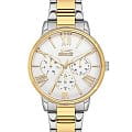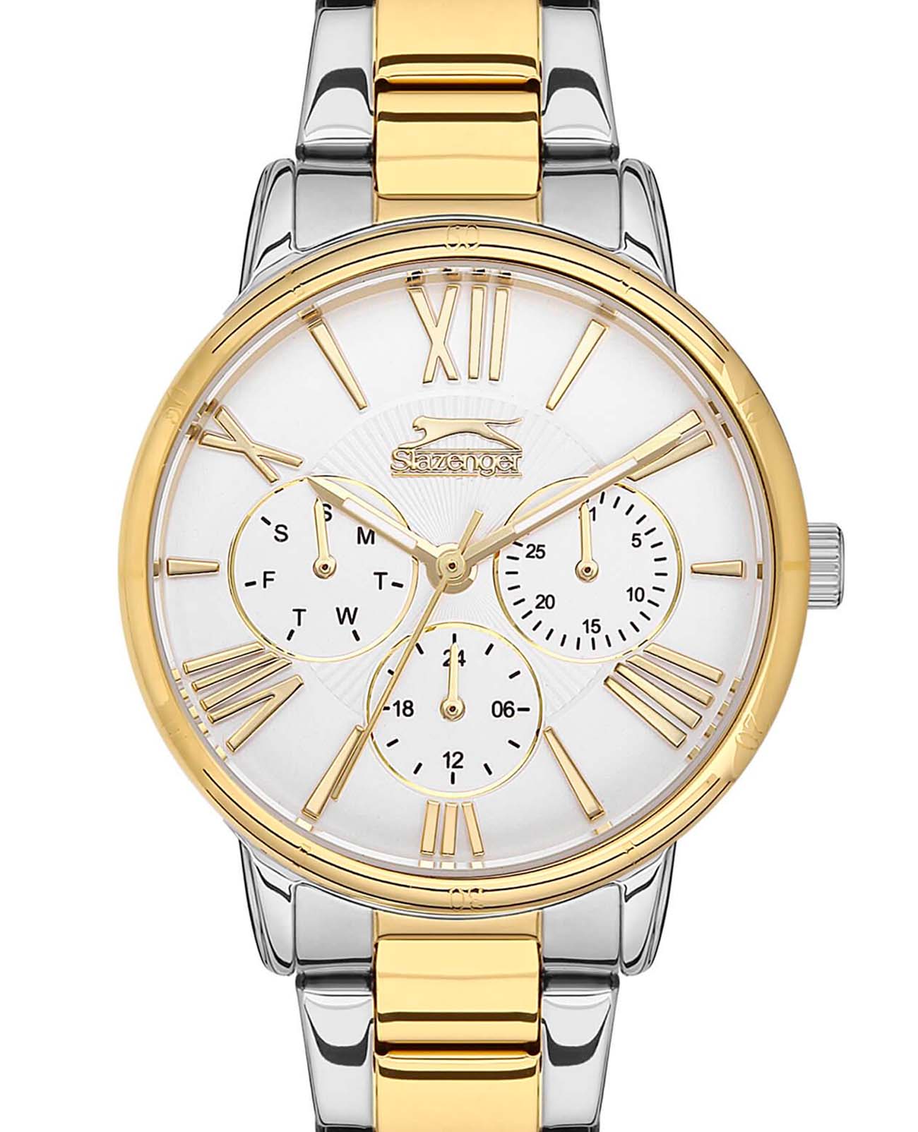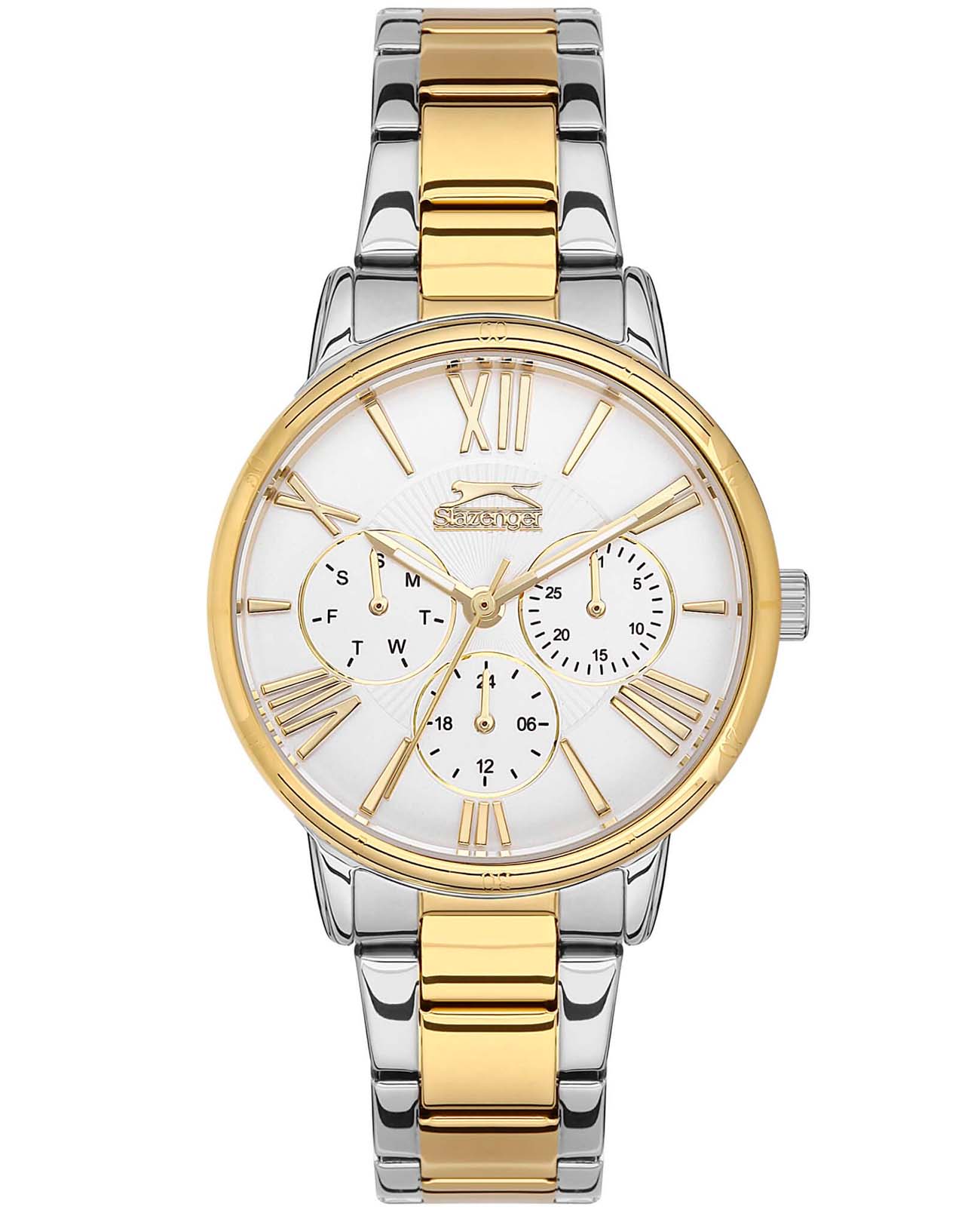Женские наручные часы Slazenger SL.09.2072.4.04 сочетают в себе элегантность и функциональность. Модель обладает круглым корпусом диаметром 35 мм, изготовленным из суперметалла, что обеспечивает высокую устойчивость к внешним воздействиям. Браслет выполнен из того же материала с частичным IP-покрытиемIP-покрытиеМетод ионного напыления. Демонстрирует повышенную устойчивость к истиранию, окислению и химическим веществам. Под воздействием высокого давления и температуры около 1500°C молекулы металла надёжно соединяются с частицами корпуса часов. и оснащен раскладной застежкойРаскладной замокДанный вариант застежки используется только на часах с металлическим браслетом. Отличительная особенность такого крепления в том, что длина браслета становится универсальной и вы можете самостоятельно отрегулировать нужный вам размер – застежка просто двигается по браслету часов., гарантирующей комфортное ношение и безопасность. Серебристый циферблат украшен малыми циферблатами, которые отображают дату, день недели и текущее время в 24-часовом формате. Для защиты используется минеральное стеклоМинеральное стеклоМинеральное стекло представляет собой искусственно выращенный минерал кварца. Такое стекло отличается особой устойчивостью к повреждениям и царапинам. Уступает по некоторым качествам сапфировому стеклу., обеспечивающее прочную защиту от царапин. Часы работают на кварцевом механизме, что гарантирует точное время без необходимости подзаводки . Водонепроницаемость достигает 3 атмосфер (WR30), что позволяет использовать их при контакте с брызгами воды, однако не рекомендуется для плавания или дайвинга.