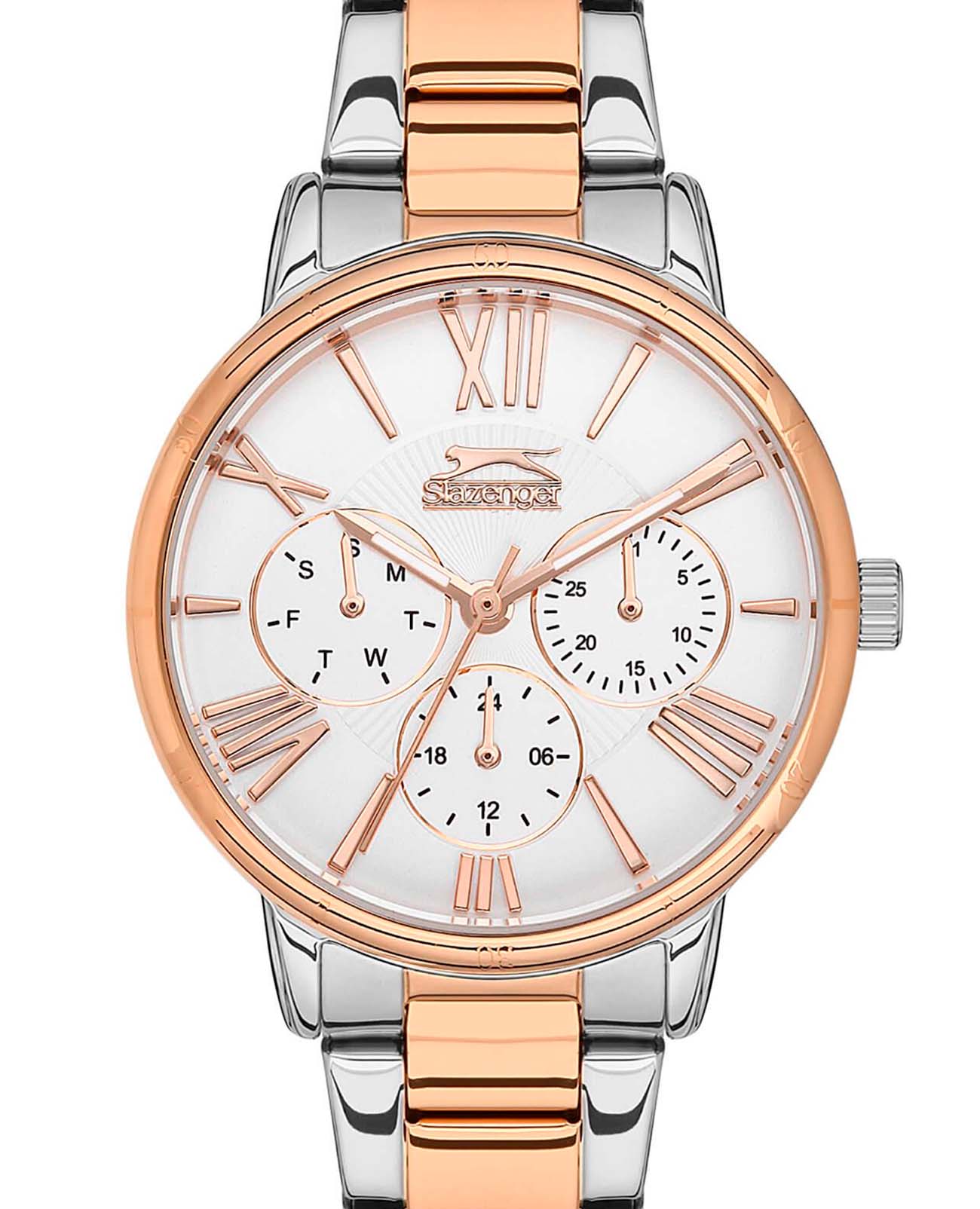 Женские наручные часы Slazenger SL.09.2072.4.05 представляют собой стильное сочетание классики и современных технологий. Модель имеет круглый корпус диаметром 35 мм, изготовленный из суперметалла, что обеспечивает высокую устойчивость к внешним воздействиям. Браслет выполнен из того же материала с частичным IP-покрытиемIP-покрытиеМетод ионного напыления. Демонстрирует повышенную устойчивость к истиранию, окислению и химическим веществам. Под воздействием высокого давления и температуры около 1500°C молекулы металла надёжно соединяются с частицами корпуса часов. и оснащен раскладной застежкойРаскладной замокДанный вариант застежки используется только на часах с металлическим браслетом. Отличительная особенность такого крепления в том, что длина браслета становится универсальной и вы можете самостоятельно отрегулировать нужный вам размер – застежка просто двигается по браслету часов., гарантирующей комфортное ношение и надежную фиксацию на запястье. Циферблат украшен малыми циферблатами, которые отображают дату, день недели и текущее время в 24-часовом формате. Для защиты используется минеральное стеклоМинеральное стеклоМинеральное стекло представляет собой искусственно выращенный минерал кварца. Такое стекло отличается особой устойчивостью к повреждениям и царапинам. Уступает по некоторым качествам сапфировому стеклу., обеспечивающее прочную защиту от царапин. Часы работают на кварцевом механизме, что гарантирует точное время без необходимости подзаводки. Водонепроницаемость достигает 3 атмосфер (WR30), что позволяет использовать их при легком контакте с водой, например, во время мытья рук или хождения под мелким дождем.