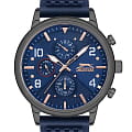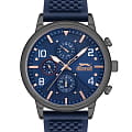 Мужские наручные часы Slazenger SL.09.2089.2.03 сочетают в себе современный дизайн и функциональность для повседневного использования. Модель обладает круглым корпусом диаметром 46 мм, изготовленным из суперметалла с серым PVD-покрытиемPVDУльтратонкое покрытие наносится в технике вакуумного напыления, сочетает в себе нитрид титана особой прочности со слоем золота или оксида хрома. Несёт в себе декоративную или защитную функцию., что обеспечивает высокую устойчивость к внешним воздействиям. Браслет выполнен из синего пластика с классической застежкой, гарантирующей комфортное ношение и безопасность. Синий циферблат имеет дополнительные малые циферблаты для отображения даты, дня недели и текущего времени в 24-часовом формате. Стрелки и метки имеют люминесцентное покрытиеЛюминесцентное покрытиеПозволяет считывать показания времени в темноте. Производители наносят на стрелки, часовые индексы, безель или поверхность циферблата светонакопительный состав, дающий холодное свечение., что позволяет легко читать время в темноте. Для защиты используется сапфировое стеклоСапфировое стеклоПрочный и надёжный материал из кристалла сапфира синтетического происхождения, характеризующийся особой твёрдостью и устойчивостью к царапинам и повреждениям., обеспечивающее высокую устойчивость к царапинам. Часы работают на кварцевом механизме, что гарантирует точное время без необходимости подзаводки. Модель также имеет класс водонепроницаемости WR50 (5 атм), что позволяет использовать их во время плавания без ныряния. Вес часов составляет 84 грамма, делая их удобными для длительного ношения.