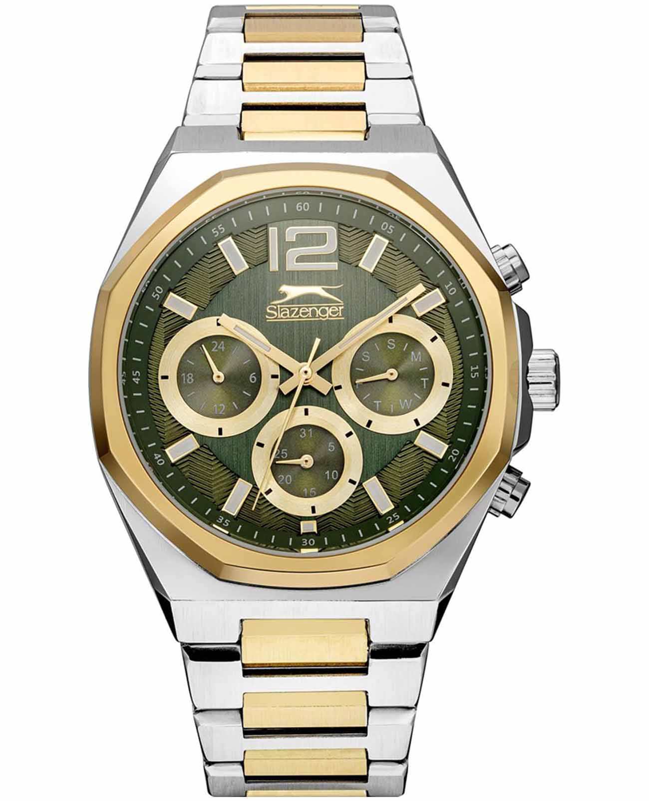 Часы Slazenger SL.09.2106.2.06 представляют собой идеальное сочетание элегантности и функциональности для стильных мужчин. Их серебристый циферблат, защищенный прочным минеральным стекломМинеральное стеклоМинеральное стекло представляет собой искусственно выращенный минерал кварца. Такое стекло отличается особой устойчивостью к повреждениям и царапинам. Уступает по некоторым качествам сапфировому стеклу., обрамлен корпусом из суперметалла диаметром 41 мм, а безельБезельВнешний ободок, закрепляющий стекло. В спортивных часах так называется поворотное кольцо с делениями на циферблате, выполняет роль таймера – замеряет отрезки времени на шкале. Неподвижный безель – элемент декора. Однонаправленно вращающийся безель на дайверских часах позволяет фиксировать моменты погружения и выныривания на поверхность. этих часов из суперметалла с золотистым IP-покрытиемIP-покрытиеМетод ионного напыления. Демонстрирует повышенную устойчивость к истиранию, окислению и химическим веществам. Под воздействием высокого давления и температуры около 1500°C молекулы металла надёжно соединяются с частицами корпуса часов.. Кварцевый механизм гарантирует точность, а водозащита 5 ATM позволяет не волноваться о случайных брызгах. Стальной браслет из суперметалла с частичным золотистым IP-покрытиемIP-покрытиеМетод ионного напыления. Демонстрирует повышенную устойчивость к истиранию, окислению и химическим веществам. Под воздействием высокого давления и температуры около 1500°C молекулы металла надёжно соединяются с частицами корпуса часов. с раскладной застёжкойРаскладная застёжкаТакой тип застёжки используется только на браслетах из металла. Она никогда не раскрывается полностью, происходит разделение на 2 и более частей. Раскладывающая застёжка снизит вероятность потери часов к минимуму., придает часовому изделию современный и изысканный вид. Функции 24-часового указателя времени, а также отображение даты и дня недели обеспечивают дополнительное удобство в повседневной жизни. Люминесцентное покрытиеЛюминесцентное покрытиеПозволяет считывать показания времени в темноте. Производители наносят на стрелки, часовые индексы, безель или поверхность циферблата светонакопительный состав, дающий холодное свечение. на стрелках и метках обеспечивает удобство считывания времени в темное время суток.