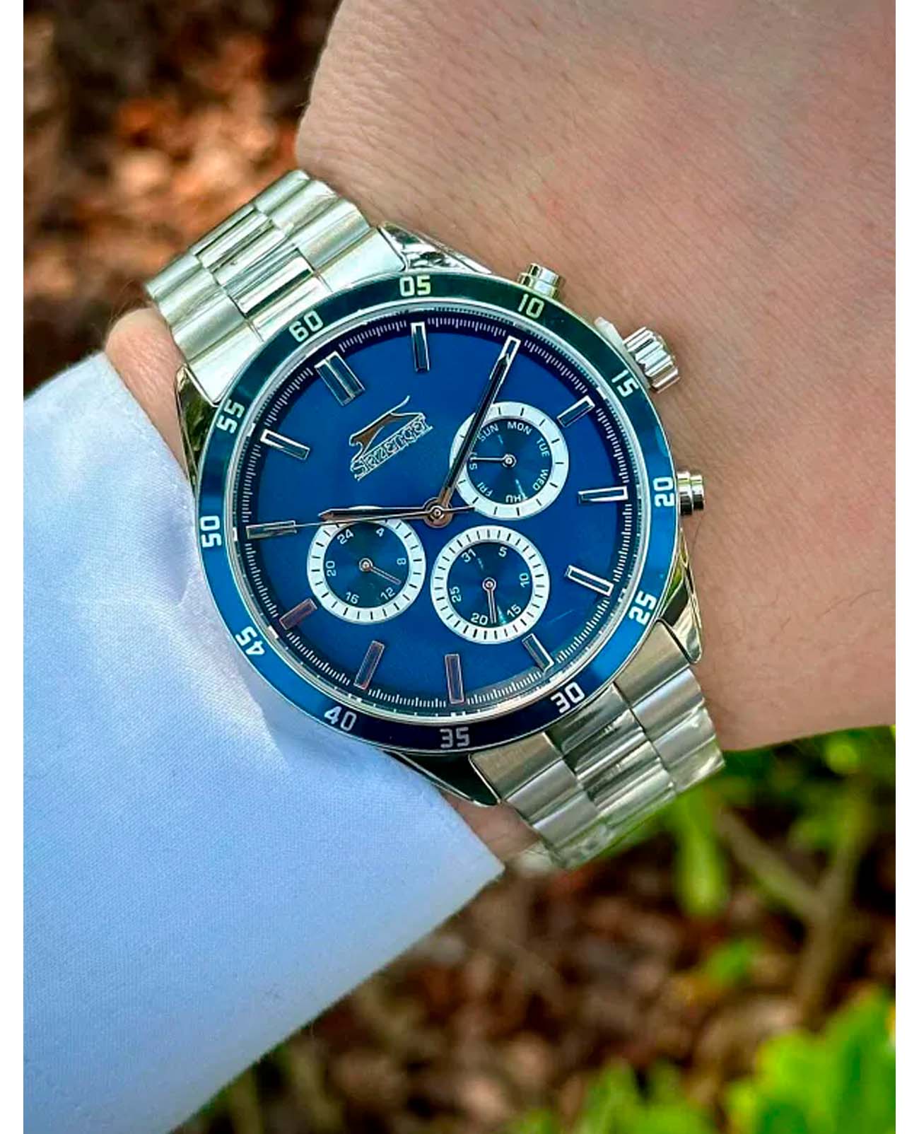 Мужские наручные часы Slazenger SL.09.2109.2.05 сочетают в себе классический дизайн и надежность современных технологий. Модель обладает круглым корпусом диаметром 45 мм, изготовленным из суперметалла, что обеспечивает высокую устойчивость к внешним воздействиям. Браслет выполнен из стали с раскладной застежкойРаскладной замокДанный вариант застежки используется только на часах с металлическим браслетом. Отличительная особенность такого крепления в том, что длина браслета становится универсальной и вы можете самостоятельно отрегулировать нужный вам размер – застежка просто двигается по браслету часов., гарантирующей комфортное ношение и безопасность. Циферблат тёмно-синего цвета декорирован стрелками с люминесцентным покрытиемЛюминесцентное покрытиеПозволяет считывать показания времени в темноте. Производители наносят на стрелки, часовые индексы, безель или поверхность циферблата светонакопительный состав, дающий холодное свечение., которые обеспечивают читаемость времени даже при недостаточной освещенности. Для защиты используется минеральное стеклоМинеральное стеклоМинеральное стекло представляет собой искусственно выращенный минерал кварца. Такое стекло отличается особой устойчивостью к повреждениям и царапинам. Уступает по некоторым качествам сапфировому стеклу., обеспечивающее прочную защиту от царапин. БезельБезельВнешний ободок, закрепляющий стекло. В спортивных часах так называется поворотное кольцо с делениями на циферблате, выполняет роль таймера – замеряет отрезки времени на шкале. Неподвижный безель – элемент декора. Однонаправленно вращающийся безель на дайверских часах позволяет фиксировать моменты погружения и выныривания на поверхность. с IP-покрытиемIP-покрытиеМетод ионного напыления. Демонстрирует повышенную устойчивость к истиранию, окислению и химическим веществам. Под воздействием высокого давления и температуры около 1500°C молекулы металла надёжно соединяются с частицами корпуса часов.. Часы работают на кварцевом механизме, что гарантирует точное время без необходимости подзаводки. Модель также оснащена мультифункциональным циферблатом, делая её практичной для повседневного использования. Водонепроницаемость часов достигает 5 атмосфер (WR50), что позволяет использовать их во время плавания, однако они не предназначены для дайвинга или других водных видов спорта. Толщина модели составляет 12 мм. SL.09.2109.2.05 — это стильный аксессуар, который станет отличным дополнением как формального, так и casual образа мужчины.