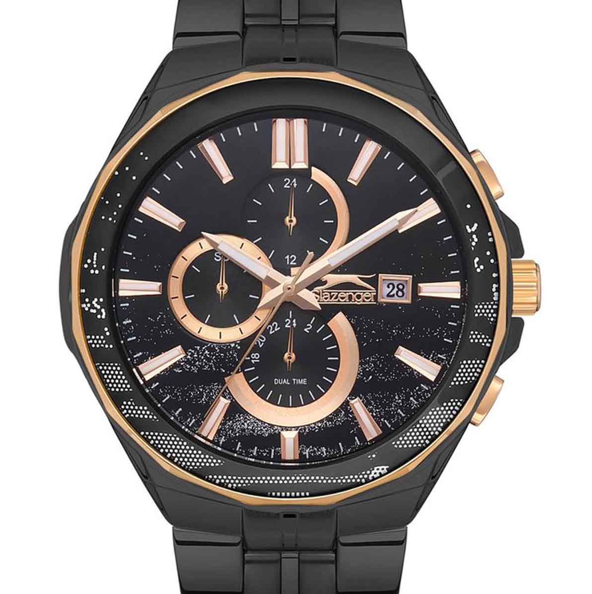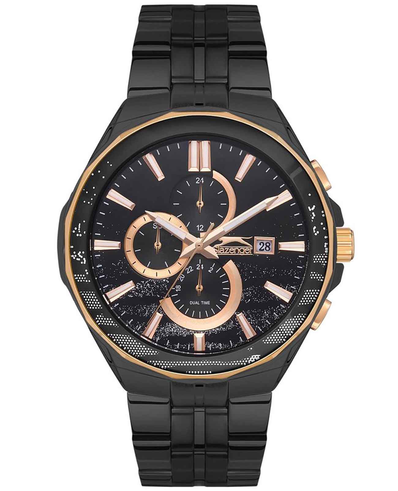 Часы Slazenger SL.09.2129.2.02 воплощают в себе элегантность и практичность, идеально подходящие для современных мужчин. Их черный циферблат, защищенный минеральным стекломМинеральное стеклоМинеральное стекло представляет собой искусственно выращенный минерал кварца. Такое стекло отличается особой устойчивостью к повреждениям и царапинам. Уступает по некоторым качествам сапфировому стеклу., заключен в такой же черный корпус диаметром 47 мм и темно-синий безельБезельВнешний ободок, закрепляющий стекло. В спортивных часах так называется поворотное кольцо с делениями на циферблате, выполняет роль таймера – замеряет отрезки времени на шкале. Неподвижный безель – элемент декора. Однонаправленно вращающийся безель на дайверских часах позволяет фиксировать моменты погружения и выныривания на поверхность., которые изготовлены из прочного суперметалла с IP-покрытиемIP-покрытиеМетод ионного напыления. Демонстрирует повышенную устойчивость к истиранию, окислению и химическим веществам. Под воздействием высокого давления и температуры около 1500°C молекулы металла надёжно соединяются с частицами корпуса часов.. Часы оснащены двойным форматом времени (12 и 24 часа), вторым часовым поясом и удобным окошком даты. Надежный кварцевый механизм обеспечивает точность, а водозащита 5 ATM делает их устойчивыми к воздействию воды. Стальной браслет из суперметалла с IP-покрытиемIP-покрытиеМетод ионного напыления. Демонстрирует повышенную устойчивость к истиранию, окислению и химическим веществам. Под воздействием высокого давления и температуры около 1500°C молекулы металла надёжно соединяются с частицами корпуса часов. с раскладной застёжкойРаскладная застёжкаТакой тип застёжки используется только на браслетах из металла. Она никогда не раскрывается полностью, происходит разделение на 2 и более частей. Раскладывающая застёжка снизит вероятность потери часов к минимуму. подчеркивает современный стиль и комфортно сидит на запястье. Часы оснащены 24-часовым указателем времени, а также функциями отображения даты и дня недели. Люминесцентное покрытиеЛюминесцентное покрытиеПозволяет считывать показания времени в темноте. Производители наносят на стрелки, часовые индексы, безель или поверхность циферблата светонакопительный состав, дающий холодное свечение. на стрелках и метках обеспечивает отличную видимость в темноте.