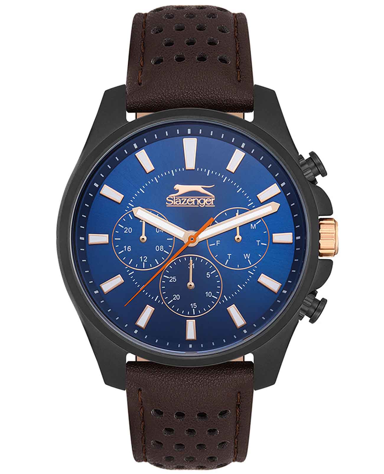 Часы Slazenger SL.09.2134.2.05 воплощают в себе элегантность и практичность, идеально подходящие для современных мужчин. Их синий циферблат, защищенный минеральным стекломМинеральное стеклоМинеральное стекло представляет собой искусственно выращенный минерал кварца. Такое стекло отличается особой устойчивостью к повреждениям и царапинам. Уступает по некоторым качествам сапфировому стеклу., заключен в черный матовый корпус диаметром 46 мм, который изготовлен из прочного суперметалла с IP-покрытиемIP-покрытиеМетод ионного напыления. Демонстрирует повышенную устойчивость к истиранию, окислению и химическим веществам. Под воздействием высокого давления и температуры около 1500°C молекулы металла надёжно соединяются с частицами корпуса часов.. Часы оснащены двойным форматом времени (12 и 24 часа), указателем дней недели и удобным окошком даты. Надежный кварцевый механизм обеспечивает точность, а водозащита 5 ATM делает их устойчивыми к воздействию воды. Ремень из натуральной кожи имеет классическую застежку, что позволяет легко регулировать его длину на запястье. Люминесцентное покрытиеЛюминесцентное покрытиеПозволяет считывать показания времени в темноте. Производители наносят на стрелки, часовые индексы, безель или поверхность циферблата светонакопительный состав, дающий холодное свечение. на стрелках и метках обеспечивает отличную видимость в темноте.