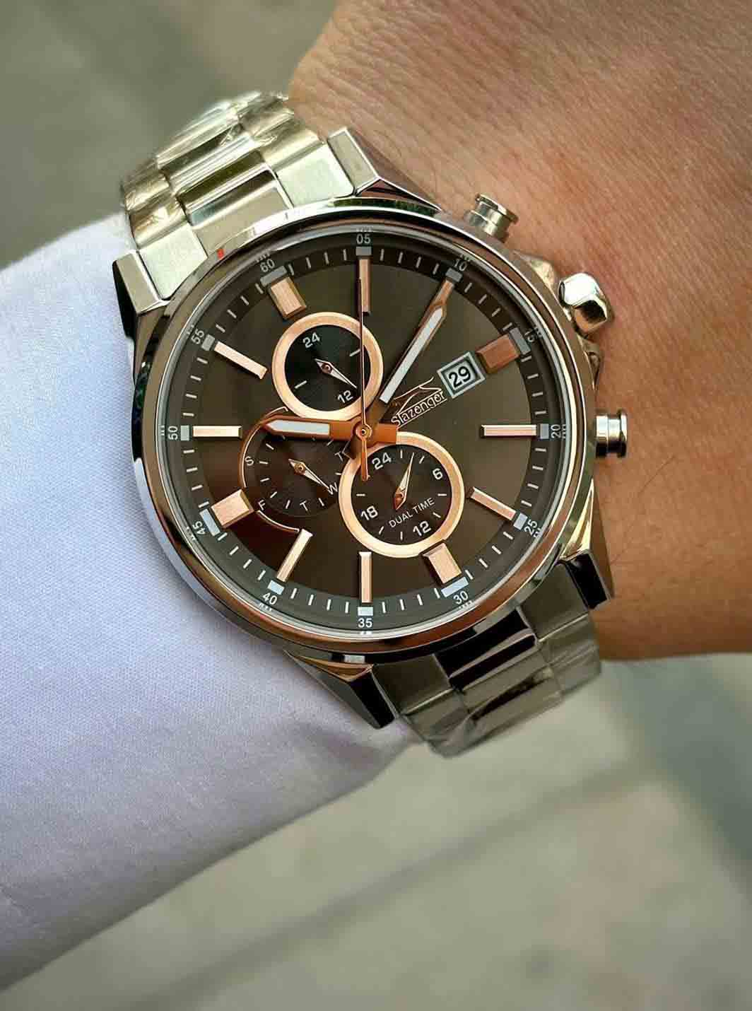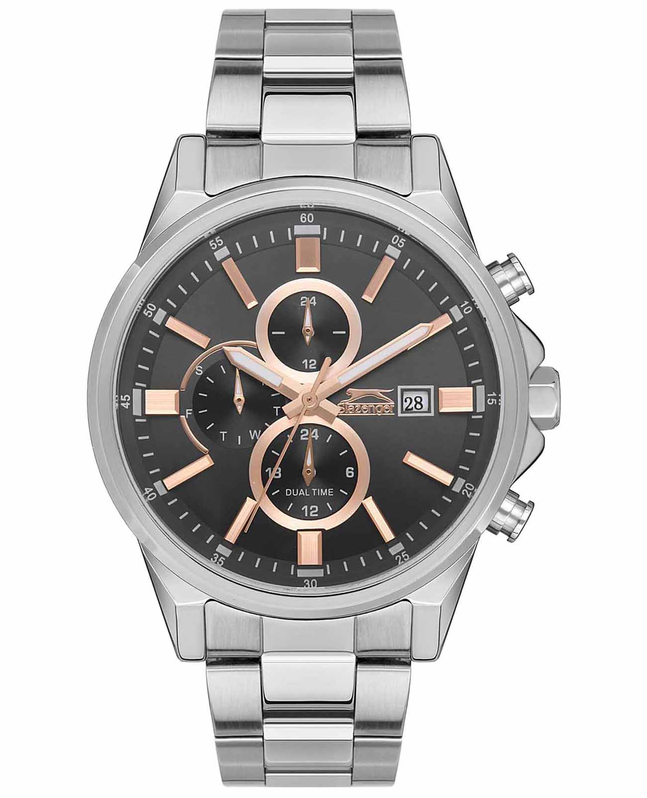 Часы Slazenger SL.09.2139.2.05 воплощают в себе элегантность и практичность, идеально подходящие для современных мужчин. Их серый циферблат защищен минеральным стекломМинеральное стеклоМинеральное стекло представляет собой искусственно выращенный минерал кварца. Такое стекло отличается особой устойчивостью к повреждениям и царапинам. Уступает по некоторым качествам сапфировому стеклу. и заключен в серебристый корпус диаметром 46 мм, который изготовлен из прочного суперметалла. Часы оснащены указателями второго часового пояса, дня недели и текущего времени в 24-х часовом формате на дополнительных малых циферблатах. Окошко даты расположено в положении 3 часов. Золотистые стрелки и метки имеют люминесцентное покрытиеЛюминесцентное покрытиеПозволяет считывать показания времени в темноте. Производители наносят на стрелки, часовые индексы, безель или поверхность циферблата светонакопительный состав, дающий холодное свечение., что позволяет легко считывать время в темноте. Надежный кварцевый механизм обеспечивает точность, а водозащита 5 ATM делает их устойчивыми к воздействию воды. Браслет из суперметалла имеет раскладную застёжкуРаскладная застёжкаТакой тип застёжки используется только на браслетах из металла. Она никогда не раскрывается полностью, происходит разделение на 2 и более частей. Раскладывающая застёжка снизит вероятность потери часов к минимуму., что подчеркивает современный стиль и позволяет легко снимать часы. Ширина ремешка 22 мм.