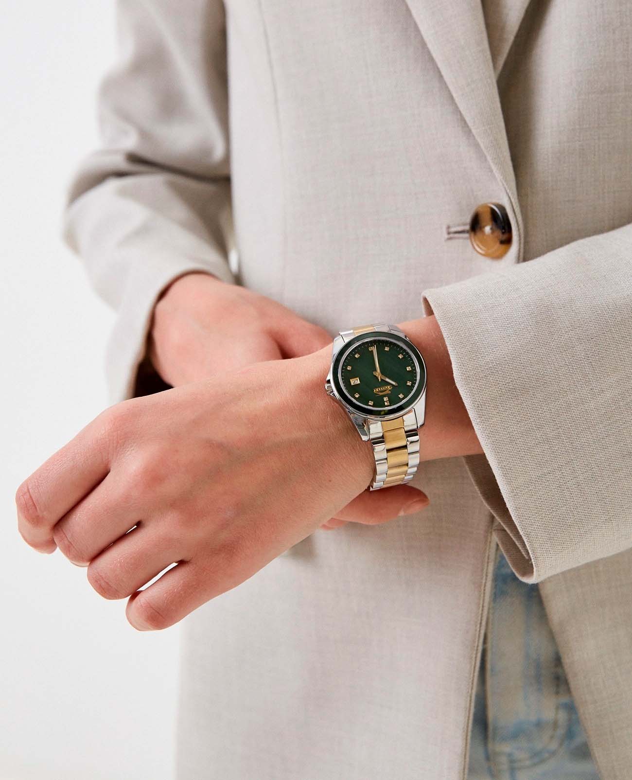 Женские наручные часы Slazenger SL.09.2142.3.03 сочетают в себе элегантный дизайн и надежность современных технологий. Модель обладает корпусом размерами 37 мм, изготовленным из суперметалла, что обеспечивает высокую устойчивость к внешним воздействиям. БезельБезельВнешний ободок, закрепляющий стекло. В спортивных часах так называется поворотное кольцо с делениями на циферблате, выполняет роль таймера – замеряет отрезки времени на шкале. Неподвижный безель – элемент декора. Однонаправленно вращающийся безель на дайверских часах позволяет фиксировать моменты погружения и выныривания на поверхность. с IP-покрытиемIP-покрытиеМетод ионного напыления. Демонстрирует повышенную устойчивость к истиранию, окислению и химическим веществам. Под воздействием высокого давления и температуры около 1500°C молекулы металла надёжно соединяются с частицами корпуса часов.. Браслет из суперметалла с частичным IP-покрытиемIP-покрытиеМетод ионного напыления. Демонстрирует повышенную устойчивость к истиранию, окислению и химическим веществам. Под воздействием высокого давления и температуры около 1500°C молекулы металла надёжно соединяются с частицами корпуса часов. гарантирует комфортное ношение и стильный внешний вид. Циферблат зеленого цвета декорирован кристаллами в виде меток. Для защиты используется минеральное стеклоМинеральное стеклоМинеральное стекло представляет собой искусственно выращенный минерал кварца. Такое стекло отличается особой устойчивостью к повреждениям и царапинам. Уступает по некоторым качествам сапфировому стеклу., обеспечивающее прочную защиту от царапин. Часы работают на кварцевом механизме, поэтому гарантирует точное время без необходимости подзаводки. Модель также оснащена функцией отображения даты, делая ее практичной для повседневного использования. Водонепроницаемость часов достигает 3 атмосфер, что позволяет использовать их при мытье рук или хождении под мелким дождем, однако не рекомендуется для плавания или других водных видов спорта. Вес модели составляет 97 грамм.