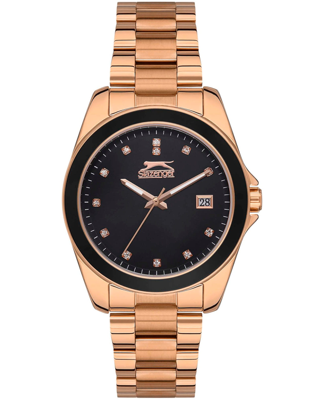 Женские наручные часы Slazenger SL.09.2142.3.04 сочетают в себе элегантный дизайн и надежность современных технологий. Модель обладает корпусом и браслетом из суперметалла с IP-покрытиемIP-покрытиеМетод ионного напыления. Демонстрирует повышенную устойчивость к истиранию, окислению и химическим веществам. Под воздействием высокого давления и температуры около 1500°C молекулы металла надёжно соединяются с частицами корпуса часов., что обеспечивает высокую устойчивость к внешним воздействиям. Браслет на раскладной застёжкеРаскладная застёжкаТакой тип застёжки используется только на браслетах из металла. Она никогда не раскрывается полностью, происходит разделение на 2 и более частей. Раскладывающая застёжка снизит вероятность потери часов к минимуму., гарантирует комфортное ношение и стильный внешний вид. Циферблат черного цвета декорирован стрелками и метками в виде кристаллов, которые обеспечивают читаемость времени даже в условиях недостаточной освещенности. Для защиты используется минеральное стеклоМинеральное стеклоМинеральное стекло представляет собой искусственно выращенный минерал кварца. Такое стекло отличается особой устойчивостью к повреждениям и царапинам. Уступает по некоторым качествам сапфировому стеклу., обеспечивающее прочную защиту от царапин. Часы работают на кварцевом механизме, питаемом от батареи, что гарантирует точное время без необходимости подзаводки. Модель также оснащена функцией отображения даты, делая ее практичной для повседневного использования. Водонепроницаемость часов достигает 3 атмосфер (30M), что позволяет использовать их при мытье рук или хождении под мелким дождем, однако не рекомендуется для плавания или других водных видов спорта.