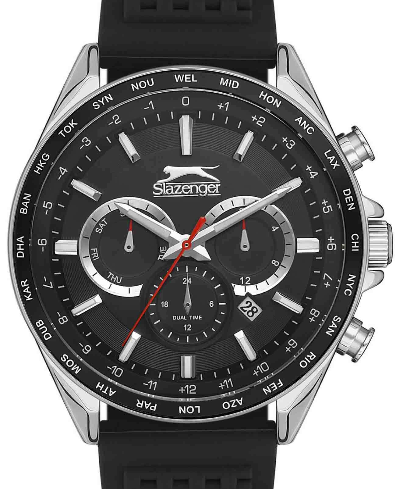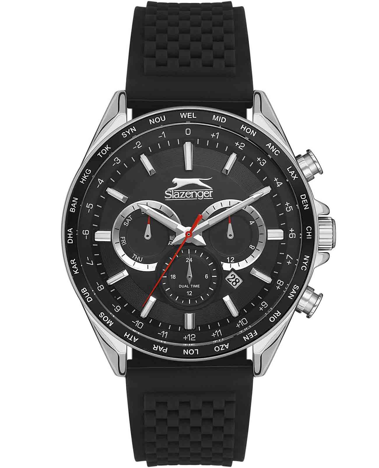 Мужские наручные часы Slazenger SL.09.2179.2.01 — стильный аксессуар с ярко выраженными спортивными чертами, который станет надежным спутником в повседневной жизни. Эти часы оснащены кварцевым механизмом, обеспечивающим высокую точность хода. Металлический корпус в сочетании с черным силиконовый ремешком на классической застежке шириной 22 мм создает гармоничный и современный образ. Диаметр корпуса составляет 45 мм, а толщина — 11 мм, что придает часам стильный и выразительный вид.  БезельБезельВнешний ободок, закрепляющий стекло. В спортивных часах так называется поворотное кольцо с делениями на циферблате, выполняет роль таймера – замеряет отрезки времени на шкале. Неподвижный безель – элемент декора. Однонаправленно вращающийся безель на дайверских часах позволяет фиксировать моменты погружения и выныривания на поверхность. с черным IP-покрытиемIP-покрытиеМетод ионного напыления. Демонстрирует повышенную устойчивость к истиранию, окислению и химическим веществам. Под воздействием высокого давления и температуры около 1500°C молекулы металла надёжно соединяются с частицами корпуса часов., что придает ему дополнительную прочность и устойчивость к износу. Минеральное стеклоМинеральное стеклоМинеральное стекло представляет собой искусственно выращенный минерал кварца. Такое стекло отличается особой устойчивостью к повреждениям и царапинам. Уступает по некоторым качествам сапфировому стеклу. защищает циферблат от царапин и внешних воздействий, а водозащита уровня WR 50 позволяет не беспокоиться о случайных контактах с водой, будь то дождь или мытье рук. Особенностью данной модели является наличие календаря, отображающего дату и день недели, а также возможность следить за временем во втором часовом поясе.  Люминесцентное покрытиеЛюминесцентное покрытиеПозволяет считывать показания времени в темноте. Производители наносят на стрелки, часовые индексы, безель или поверхность циферблата светонакопительный состав, дающий холодное свечение. на стрелках и метках обеспечивает отличную видимость в темноте.