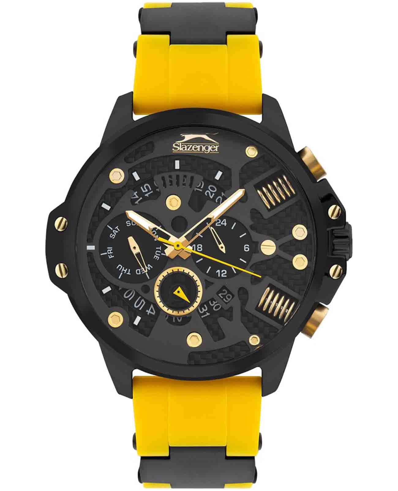 Часы Slazenger SL.09.2212.2.04 представляют собой стильный и функциональный аксессуар, созданный для современных мужчин, ценящих качество и надежность. Они оснащены кварцевым механизмом, который обеспечивает точность хода и минимальную необходимость в обслуживании. Люминесцентное покрытиеЛюминесцентное покрытиеПозволяет считывать показания времени в темноте. Производители наносят на стрелки, часовые индексы, безель или поверхность циферблата светонакопительный состав, дающий холодное свечение. на стрелках и метках обеспечивает отличную видимость в темноте. Благодаря водозащите уровня WR 50 (5 ATM), эти часы отлично справляются с воздействием влаги, что делает их подходящими для повседневного ношения и активного образа жизни. Минеральное стеклоМинеральное стеклоМинеральное стекло представляет собой искусственно выращенный минерал кварца. Такое стекло отличается особой устойчивостью к повреждениям и царапинам. Уступает по некоторым качествам сапфировому стеклу. защищает циферблат от царапин и повреждений, гарантируя долгий срок службы. Корпус часов диаметром 47 мм и толщиной 13 мм выполнен из прочного суперметалла с черным IP-покрытиемIP-покрытиеМетод ионного напыления. Демонстрирует повышенную устойчивость к истиранию, окислению и химическим веществам. Под воздействием высокого давления и температуры около 1500°C молекулы металла надёжно соединяются с частицами корпуса часов., что придаёт им стильный и современный вид. Силиконовый желтый браслет, дополненный элементами из суперметалла с черным IP-покрытиемIP-покрытиеМетод ионного напыления. Демонстрирует повышенную устойчивость к истиранию, окислению и химическим веществам. Под воздействием высокого давления и температуры около 1500°C молекулы металла надёжно соединяются с частицами корпуса часов., обеспечивает комфорт при носке и надёжно фиксирует часы на запястье, а его размеры (22-20 мм) подходят для большинства мужчин. Часы оснащены рядом полезных функций, таких как индикация даты, дня недели и 24-часовой указатель времени, что делает их не только стильным, но и практичным аксессуаром. Вес модели составляет 110 г, что делает их лёгкими и удобными для ежедневного ношения.