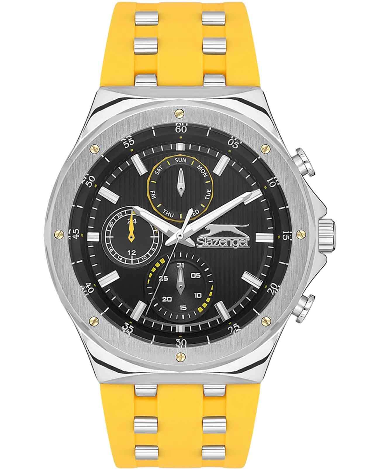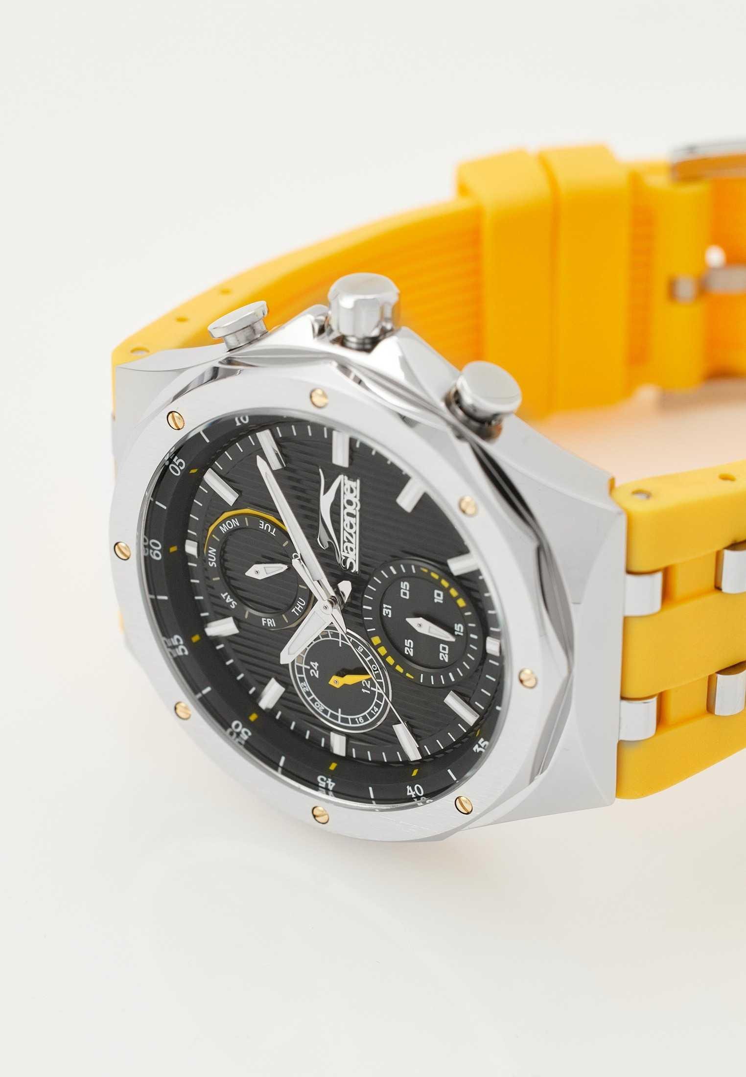 Мужские наручные часы Slazenger SL.09.2218.2.05 — идеальный аксессуар для тех, кто ценит стиль и функциональность. Эти часы, созданные известным британским брендом, отличаются высоким качеством и надежностью. Оснащенные кварцевым механизмом, они гарантируют точность хода и долгий срок службы. Корпус часов выполнен из прочного металла, а черный циферблат защищен минеральным стекломМинеральное стеклоМинеральное стекло представляет собой искусственно выращенный минерал кварца. Такое стекло отличается особой устойчивостью к повреждениям и царапинам. Уступает по некоторым качествам сапфировому стеклу., устойчивым к царапинам и повреждениям. Желтый резиновый ремешок с металлическими вставками и классической застежкой обеспечивает комфортное ношение и надежную фиксацию на запястье. Диаметр корпуса составляет 46 мм, а толщина — 12 мм, что придает часам современный и стильный вид. Благодаря водозащите уровня WR 50, вы можете не беспокоиться о случайных попаданиях влаги, что делает эти часы идеальными для повседневного использования. Стрелки снабжены люминесцентным покрытиемЛюминесцентное покрытиеПозволяет считывать показания времени в темноте. Производители наносят на стрелки, часовые индексы, безель или поверхность циферблата светонакопительный состав, дающий холодное свечение., что позволяет легко считывать время в темноте. Функциональность модели включает в себя отображение даты, дня недели и времени в 24-часовом формате на дополнительных малых циферблатах, что делает часы не только стильными, но и практичными.