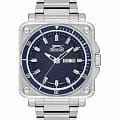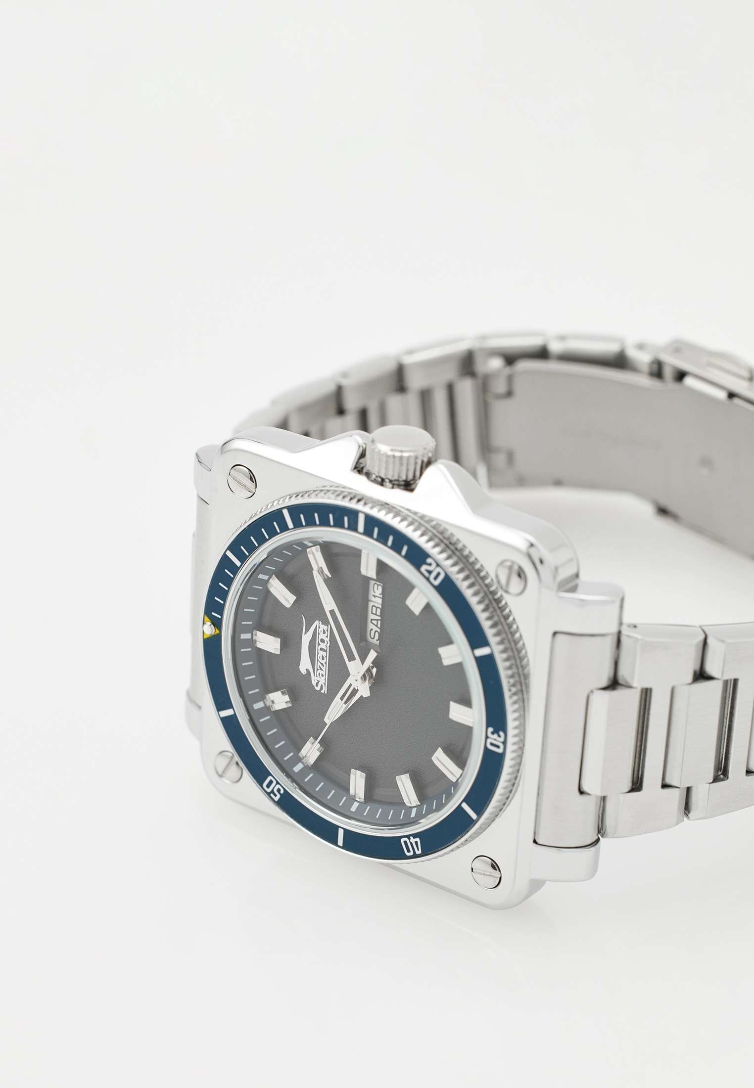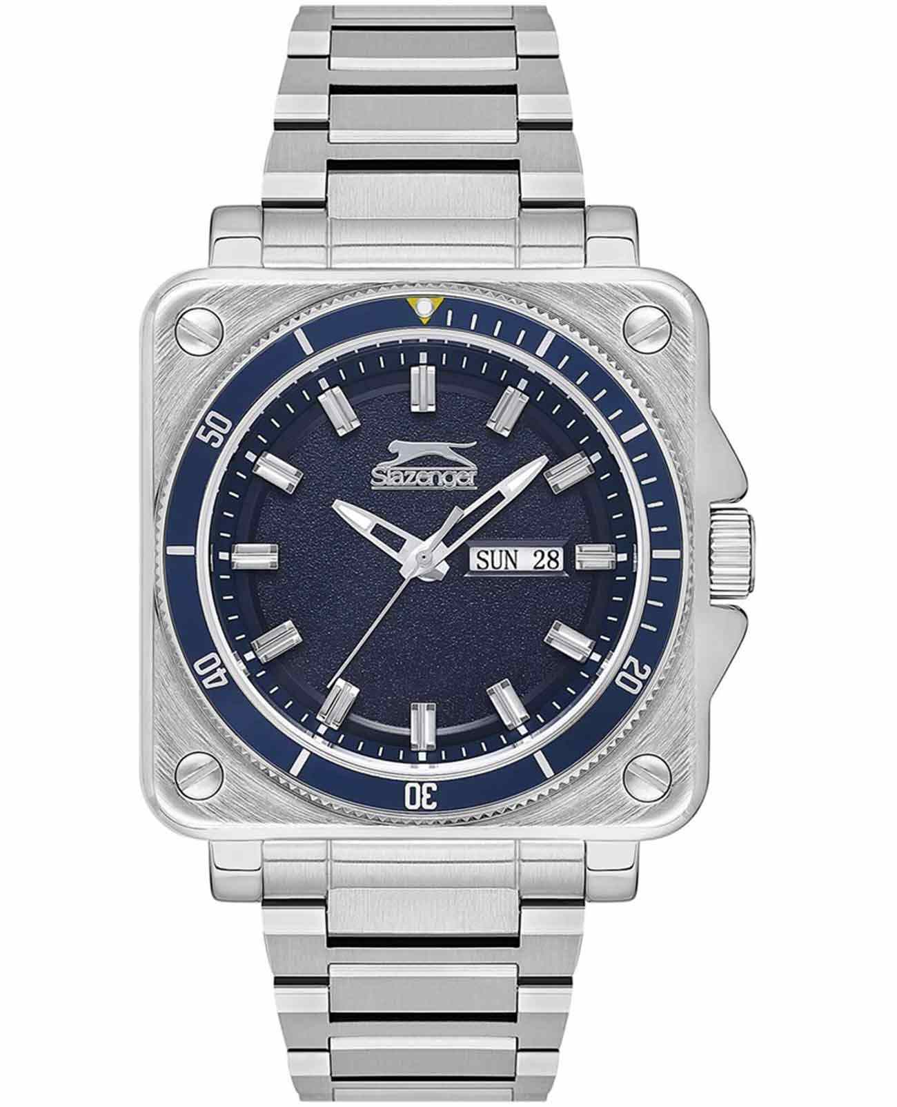 Часы Slazenger SL.09.2232.1.03 — это современная модель, сочетающая стиль и практичность. Корпус квадратной формы выполнен из прочного металла, а круглый синий циферблат придает дизайну особую выразительность. На вращающийся безельБезельВнешний ободок, закрепляющий стекло. В спортивных часах так называется поворотное кольцо с делениями на циферблате, выполняет роль таймера – замеряет отрезки времени на шкале. Неподвижный безель – элемент декора. Однонаправленно вращающийся безель на дайверских часах позволяет фиксировать моменты погружения и выныривания на поверхность. нанесено синее IP-покрытиеIP-покрытиеМетод ионного напыления. Демонстрирует повышенную устойчивость к истиранию, окислению и химическим веществам. Под воздействием высокого давления и температуры около 1500°C молекулы металла надёжно соединяются с частицами корпуса часов.. Серебристый металлический браслет снабжен надежной раскладной застёжкойРаскладная застёжкаТакой тип застёжки используется только на браслетах из металла. Она никогда не раскрывается полностью, происходит разделение на 2 и более частей. Раскладывающая застёжка снизит вероятность потери часов к минимуму., обеспечивающей удобство при повседневном ношении. Модель оснащена кварцевым механизмом, минеральное стеклоМинеральное стеклоМинеральное стекло представляет собой искусственно выращенный минерал кварца. Такое стекло отличается особой устойчивостью к повреждениям и царапинам. Уступает по некоторым качествам сапфировому стеклу., защищающим от случайных повреждений, и водозащитой уровня WR 50, позволяющей не бояться контакта с водой в повседневных ситуациях. На циферблате расположены окошки даты и дня недели. Для удобства использования в темное время суток предусмотрено люминесцентное покрытиеЛюминесцентное покрытиеПозволяет считывать показания времени в темноте. Производители наносят на стрелки, часовые индексы, безель или поверхность циферблата светонакопительный состав, дающий холодное свечение. стрелок. Заводная головка дополнительно защищена от случайных нажатий. Габариты корпуса составляют 43 на 43 мм, толщина — 11 мм.
