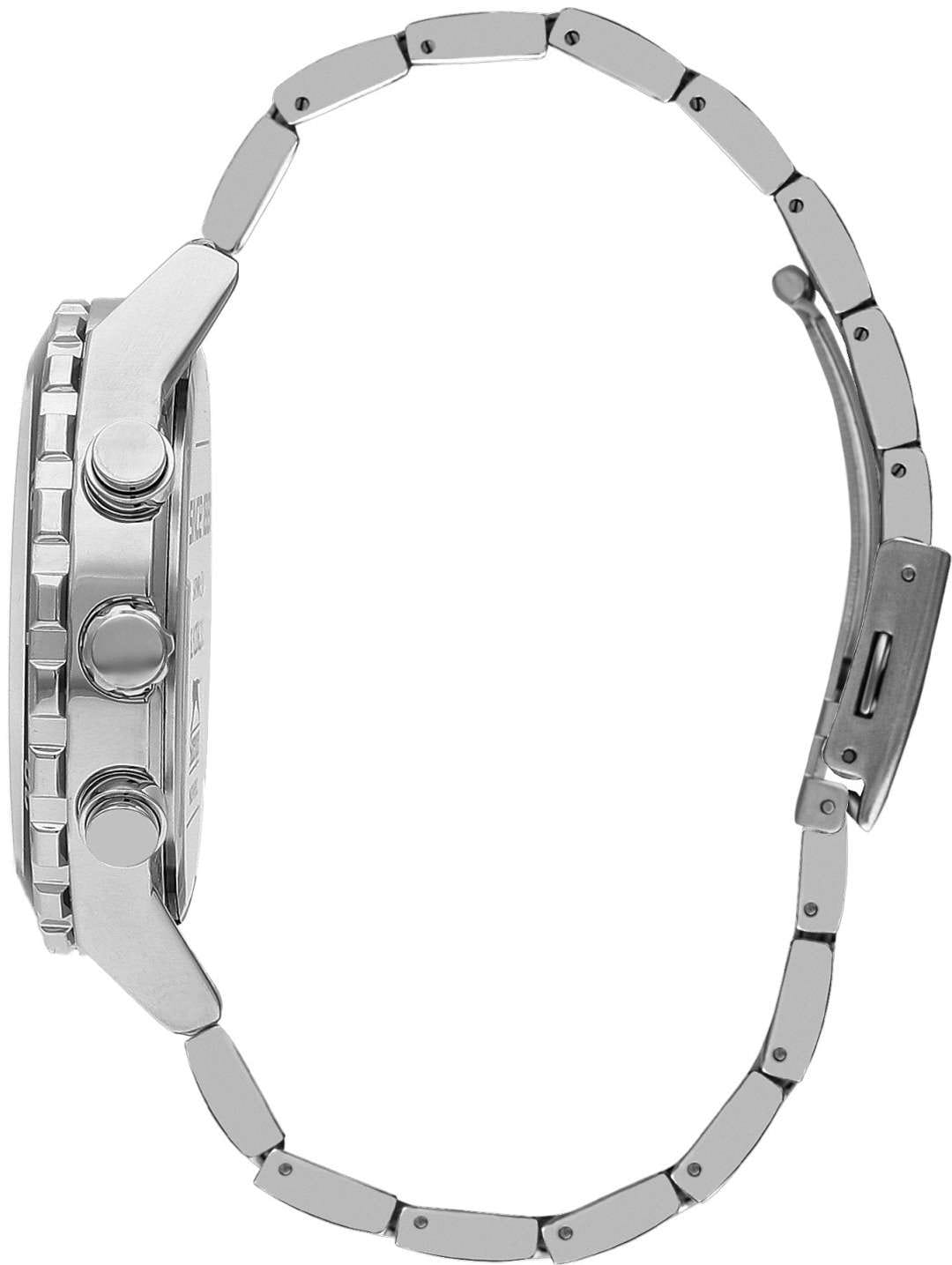 Часы Slazenger SL.09.2236.2.03 — это стильная и надежная модель, которая станет отличным выбором для активного современного мужчины. Крупный корпус диаметром 46 мм выполнен из прочного металла, а серебристый металлический браслет оснащён удобной раскладной застёжкойРаскладная застёжкаТакой тип застёжки используется только на браслетах из металла. Она никогда не раскрывается полностью, происходит разделение на 2 и более частей. Раскладывающая застёжка снизит вероятность потери часов к минимуму., что обеспечивает комфорт при повседневном ношении. На безельБезельВнешний ободок, закрепляющий стекло. В спортивных часах так называется поворотное кольцо с делениями на циферблате, выполняет роль таймера – замеряет отрезки времени на шкале. Неподвижный безель – элемент декора. Однонаправленно вращающийся безель на дайверских часах позволяет фиксировать моменты погружения и выныривания на поверхность. нанесено черное и зеленое IP-покрытиеIP-покрытиеМетод ионного напыления. Демонстрирует повышенную устойчивость к истиранию, окислению и химическим веществам. Под воздействием высокого давления и температуры около 1500°C молекулы металла надёжно соединяются с частицами корпуса часов.. Минеральное стеклоМинеральное стеклоМинеральное стекло представляет собой искусственно выращенный минерал кварца. Такое стекло отличается особой устойчивостью к повреждениям и царапинам. Уступает по некоторым качествам сапфировому стеклу. защищает текстурированный зеленый циферблат от случайных царапин, а водозащита уровня WR 50 позволяет не переживать о попадании влаги при контакте с водой. На циферблате расположены дополнительные малые циферблаты с отображением даты, дня недели и времени в 24-часовом формате, что делает использование часов максимально функциональным. Для удобства использования в темное время суток предусмотрено люминесцентное покрытиеЛюминесцентное покрытиеПозволяет считывать показания времени в темноте. Производители наносят на стрелки, часовые индексы, безель или поверхность циферблата светонакопительный состав, дающий холодное свечение. стрелок. Толщина корпуса составляет 13 мм, вес часов — 152 грамма.