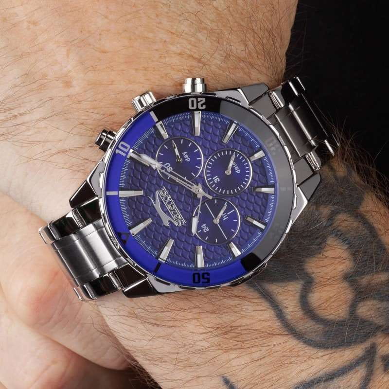 Часы Slazenger SL.09.2236.2.06 — это стильная и надежная модель, которая станет отличным выбором для активного современного мужчины. Крупный корпус диаметром 46 мм выполнен из прочного металла, а серебристый металлический браслет оснащён удобной раскладной застёжкойРаскладная застёжкаТакой тип застёжки используется только на браслетах из металла. Она никогда не раскрывается полностью, происходит разделение на 2 и более частей. Раскладывающая застёжка снизит вероятность потери часов к минимуму., что обеспечивает комфорт при повседневном ношении. На безельБезельВнешний ободок, закрепляющий стекло. В спортивных часах так называется поворотное кольцо с делениями на циферблате, выполняет роль таймера – замеряет отрезки времени на шкале. Неподвижный безель – элемент декора. Однонаправленно вращающийся безель на дайверских часах позволяет фиксировать моменты погружения и выныривания на поверхность. нанесено черное и синее IP-покрытиеIP-покрытиеМетод ионного напыления. Демонстрирует повышенную устойчивость к истиранию, окислению и химическим веществам. Под воздействием высокого давления и температуры около 1500°C молекулы металла надёжно соединяются с частицами корпуса часов.. Минеральное стеклоМинеральное стеклоМинеральное стекло представляет собой искусственно выращенный минерал кварца. Такое стекло отличается особой устойчивостью к повреждениям и царапинам. Уступает по некоторым качествам сапфировому стеклу. защищает текстурированный синий циферблат от случайных царапин, а водозащита уровня WR 50 позволяет не переживать о попадании влаги при контакте с водой. На циферблате расположены дополнительные малые циферблаты с отображением даты, дня недели и времени в 24-часовом формате, что делает использование часов максимально функциональным. Для удобства использования в темное время суток предусмотрено люминесцентное покрытиеЛюминесцентное покрытиеПозволяет считывать показания времени в темноте. Производители наносят на стрелки, часовые индексы, безель или поверхность циферблата светонакопительный состав, дающий холодное свечение. стрелок. Толщина корпуса составляет 13 мм, вес часов — 152 грамма.