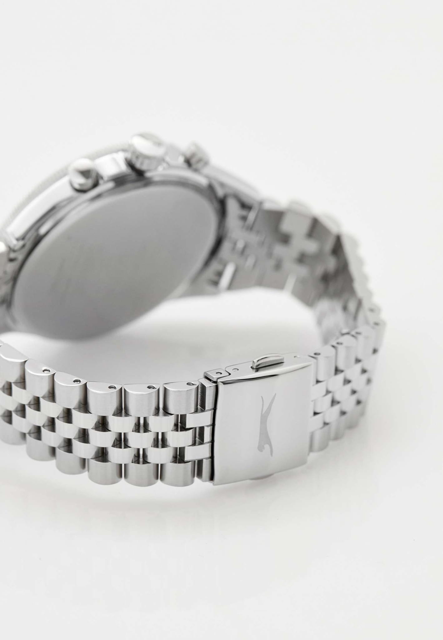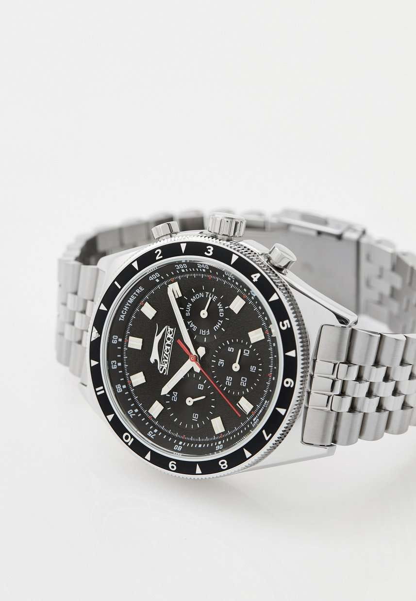 Часы Slazenger SL.09.2248.2.01 — это современная модель с выразительным спортивным характером, идеально подходящая для активного образа жизни. Корпус выполнен из прочного металла, черный циферблат защищён минеральным стекломМинеральное стеклоМинеральное стекло представляет собой искусственно выращенный минерал кварца. Такое стекло отличается особой устойчивостью к повреждениям и царапинам. Уступает по некоторым качествам сапфировому стеклу., устойчивым к царапинам. Часы также оснащены шкалой тахиметраТахиметрРазмеченная шкала, располагается на ободке или безеле часов. Тахиметр позволяет рассчитать скорость на определённом участке пути, расстояние измеряется в километрах или милях., что добавляет им функциональности и может быть полезно для измерения скорости. На безельБезельВнешний ободок, закрепляющий стекло. В спортивных часах так называется поворотное кольцо с делениями на циферблате, выполняет роль таймера – замеряет отрезки времени на шкале. Неподвижный безель – элемент декора. Однонаправленно вращающийся безель на дайверских часах позволяет фиксировать моменты погружения и выныривания на поверхность. нанесено черное IP-покрытиеIP-покрытиеМетод ионного напыления. Демонстрирует повышенную устойчивость к истиранию, окислению и химическим веществам. Под воздействием высокого давления и температуры около 1500°C молекулы металла надёжно соединяются с частицами корпуса часов.. Диаметр корпуса составляет 46 мм, толщина — 11 мм, а ширина браслета — 22 мм. Часы оснащены металлическим браслетом с надежной раскладной застёжкойРаскладная застёжкаТакой тип застёжки используется только на браслетах из металла. Она никогда не раскрывается полностью, происходит разделение на 2 и более частей. Раскладывающая застёжка снизит вероятность потери часов к минимуму., благодаря чему часы удобно сидят на руке и не вызывают дискомфорта даже при длительном ношении. Вес модели составляет 130 грамм. Надёжный кварцевый механизм обеспечивает точность времени, а уровень водозащиты WR 50 позволяет использовать часы в повседневных условиях, не опасаясь случайных брызг или дождя. Для удобства использования в темное время суток предусмотрено люминесцентное покрытиеЛюминесцентное покрытиеПозволяет считывать показания времени в темноте. Производители наносят на стрелки, часовые индексы, безель или поверхность циферблата светонакопительный состав, дающий холодное свечение. стрелок и меток. Дополнительные малые циферблаты показывают дату, день недели и текущее время в 24-часовом формате, что делает использование часов ещё более удобным и функциональным.
