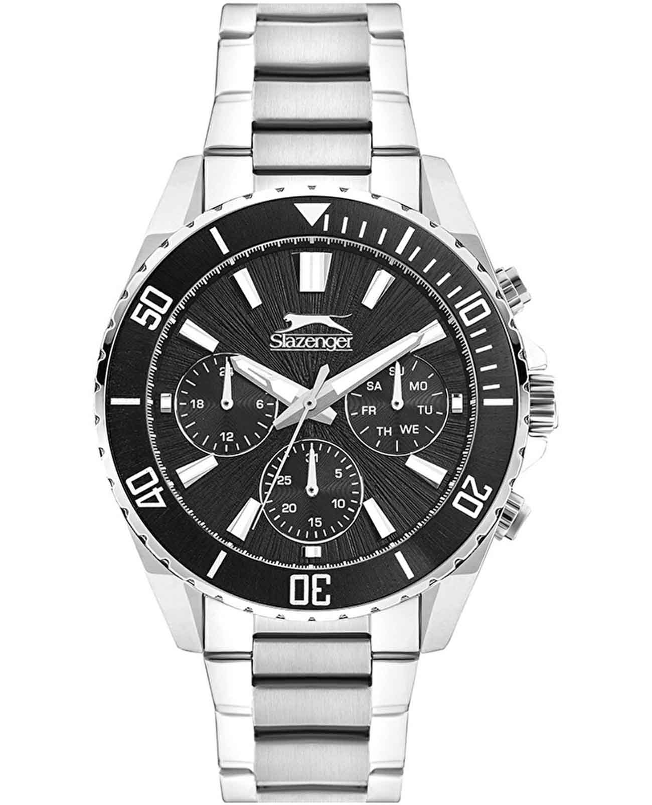 Часы Slazenger SL.09.2273.2.01 – стильный и функциональный аксессуар, который станет достойным дополнением к вашему образу. Модель оснащена надежным кварцевым механизмом, заключенным в корпус из инновационного суперметалла – прочного сплава на основе меди с пониженным содержанием цинка и никеля и специальным покрытием, устойчивым к износу. На безельБезельВнешний ободок, закрепляющий стекло. В спортивных часах так называется поворотное кольцо с делениями на циферблате, выполняет роль таймера – замеряет отрезки времени на шкале. Неподвижный безель – элемент декора. Однонаправленно вращающийся безель на дайверских часах позволяет фиксировать моменты погружения и выныривания на поверхность. нанесено черное IP-покрытиеIP-покрытиеМетод ионного напыления. Демонстрирует повышенную устойчивость к истиранию, окислению и химическим веществам. Под воздействием высокого давления и температуры около 1500°C молекулы металла надёжно соединяются с частицами корпуса часов., что придает аксессуару утончённый и универсальный внешний вид. Чёрный циферблат под минеральным стекломМинеральное стеклоМинеральное стекло представляет собой искусственно выращенный минерал кварца. Такое стекло отличается особой устойчивостью к повреждениям и царапинам. Уступает по некоторым качествам сапфировому стеклу. дополнен отдельными счетчиками: 24-часовой указатель времени, индикаторы даты и дня недели. Диаметр корпуса составляет 44 мм, а толщина – 12 мм, что обеспечивает комфортную посадку на запястье и подчёркивает современный стиль часов. Браслет из суперметалла и раскладной застёжкойРаскладная застёжкаТакой тип застёжки используется только на браслетах из металла. Она никогда не раскрывается полностью, происходит разделение на 2 и более частей. Раскладывающая застёжка снизит вероятность потери часов к минимуму. обеспечивает комфортную посадку. Стрелки и метки с люминесцентным покрытиемЛюминесцентное покрытиеПозволяет считывать показания времени в темноте. Производители наносят на стрелки, часовые индексы, безель или поверхность циферблата светонакопительный состав, дающий холодное свечение. удобно подсвечиваются в темноте после зарядки на свету. Водонепроницаемость 5 АТМ защищает механизм от брызг и дождя, позволяя не беспокоиться о сохранности аксессуара в повседневной жизни. Эта модель станет отличным выбором для ежедневного ношения или особых случаев и прекрасным подарком для мужчины к любому празднику.
