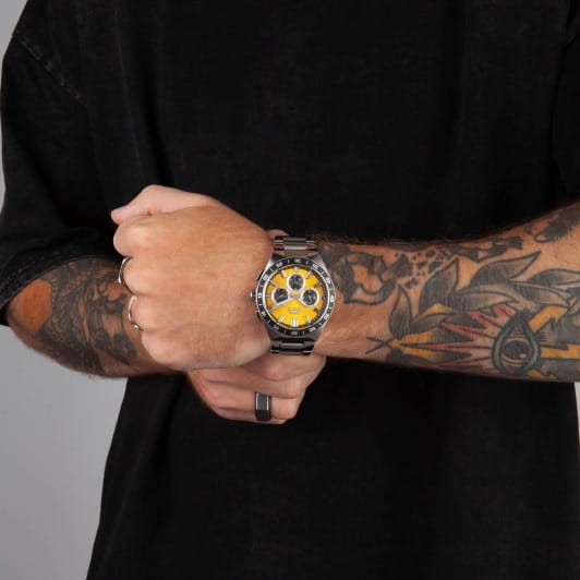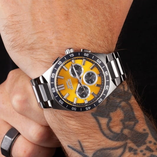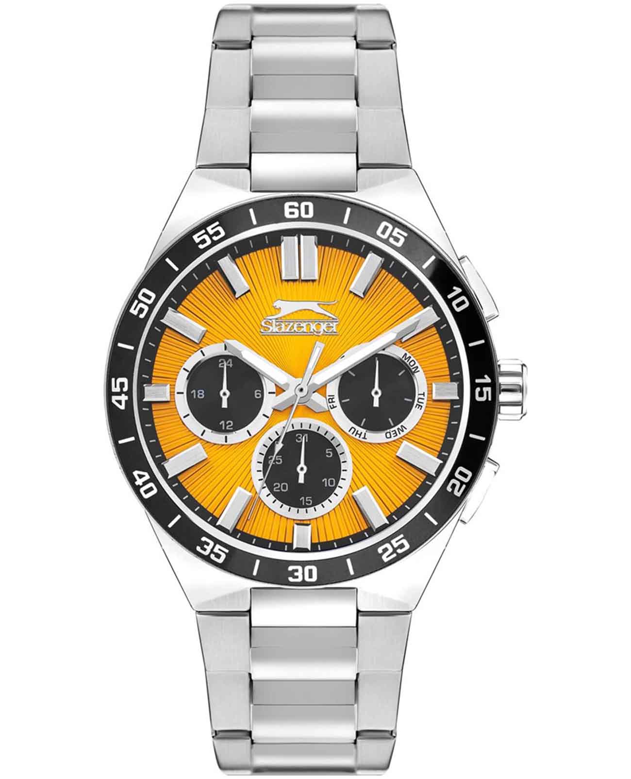 Часы Slazenger SL.09.2285.2.02 — это стильное решение для тех, кто ценит сочетание выразительного дизайна и функциональности. Модель оснащена надежным кварцевым механизмом, который заключен в прочный корпус диаметром 45 мм и толщиной 13 мм, выполненный из суперметалла — современного сплава на основе меди с пониженным содержанием цинка и никеля, обладающего высокой прочностью и устойчивостью к износу, а на безельБезельВнешний ободок, закрепляющий стекло. В спортивных часах так называется поворотное кольцо с делениями на циферблате, выполняет роль таймера – замеряет отрезки времени на шкале. Неподвижный безель – элемент декора. Однонаправленно вращающийся безель на дайверских часах позволяет фиксировать моменты погружения и выныривания на поверхность. нанесено черное IP-покрытиеIP-покрытиеМетод ионного напыления. Демонстрирует повышенную устойчивость к истиранию, окислению и химическим веществам. Под воздействием высокого давления и температуры около 1500°C молекулы металла надёжно соединяются с частицами корпуса часов. и секундная шкала. Минеральное стеклоМинеральное стеклоМинеральное стекло представляет собой искусственно выращенный минерал кварца. Такое стекло отличается особой устойчивостью к повреждениям и царапинам. Уступает по некоторым качествам сапфировому стеклу. защищает желтый циферблат от царапин и повреждений. Часы оснащены дополнительными циферблатами для отображения 24-часового времени, даты и дня недели, что делает использование еще более удобным. Браслет также выполнен из суперметалла с раскладной застёжкойРаскладная застёжкаТакой тип застёжки используется только на браслетах из металла. Она никогда не раскрывается полностью, происходит разделение на 2 и более частей. Раскладывающая застёжка снизит вероятность потери часов к минимуму. и гармонично дополняет общий облик аксессуара. Циферблат оснащён люминесцентным покрытиемЛюминесцентное покрытиеПозволяет считывать показания времени в темноте. Производители наносят на стрелки, часовые индексы, безель или поверхность циферблата светонакопительный состав, дающий холодное свечение. стрелок и меток, что позволяет легко определять время даже в условиях плохой освещенности. Класс водозащиты 5 АТМ позволяет не бояться случайных брызг и дождя, а гарантия 12 месяцев подтверждает высокое качество изделия.
