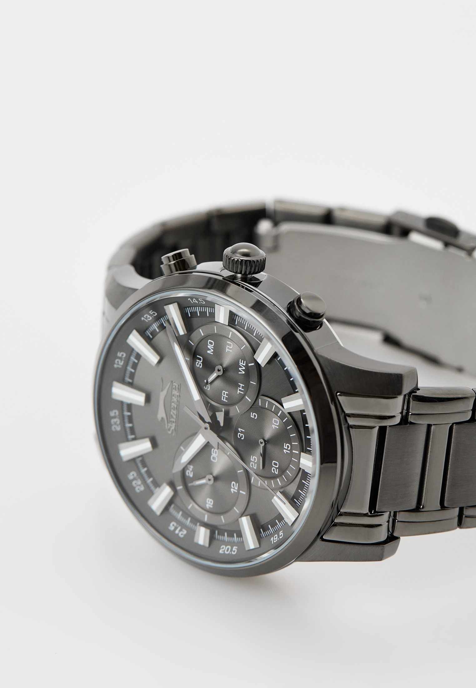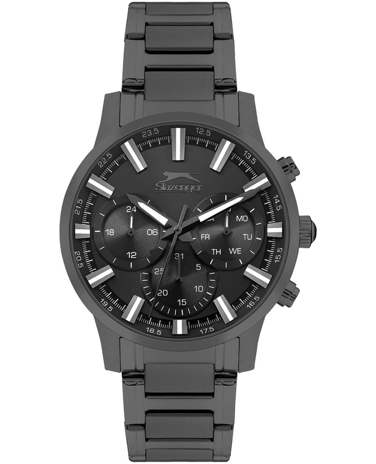 Мужские наручные часы Slazenger SL.09.2294.2.04 сочетают стильный современный дизайн и высокую функциональность. Корпус из прочного металла с черным IP-покрытиемIP-покрытиеМетод ионного напыления. Демонстрирует повышенную устойчивость к истиранию, окислению и химическим веществам. Под воздействием высокого давления и температуры около 1500°C молекулы металла надёжно соединяются с частицами корпуса часов. диаметром 44 мм и толщиной 13 мм защищён минеральным стекломМинеральное стеклоМинеральное стекло представляет собой искусственно выращенный минерал кварца. Такое стекло отличается особой устойчивостью к повреждениям и царапинам. Уступает по некоторым качествам сапфировому стеклу., устойчивым к царапинам. Черный металлический браслет с IP-покрытиемIP-покрытиеМетод ионного напыления. Демонстрирует повышенную устойчивость к истиранию, окислению и химическим веществам. Под воздействием высокого давления и температуры около 1500°C молекулы металла надёжно соединяются с частицами корпуса часов. шириной 22 мм оснащён надёжной раскладной застёжкойРаскладная застёжкаТакой тип застёжки используется только на браслетах из металла. Она никогда не раскрывается полностью, происходит разделение на 2 и более частей. Раскладывающая застёжка снизит вероятность потери часов к минимуму., обеспечивающей комфортное ношение. Кварцевый механизм гарантирует точность хода, а водозащита уровня WR 50 позволяет не снимать часы при мытье рук или во время дождя. Модель оснащена люминесцентным покрытиемЛюминесцентное покрытиеПозволяет считывать показания времени в темноте. Производители наносят на стрелки, часовые индексы, безель или поверхность циферблата светонакопительный состав, дающий холодное свечение. стрелок и меток, что облегчает считывание времени в темноте. На малых циферблатах отображаются дата, день недели и текущее время в 24-часовом формате, что делает модель особенно удобной для повседневного использования. Циферблат часов насыщенного черного цвета. Заводная головка с защитой и завинчивающаяся задняя крышка обеспечивают дополнительную надежность конструкции. Вес часов составляет 123 грамма.