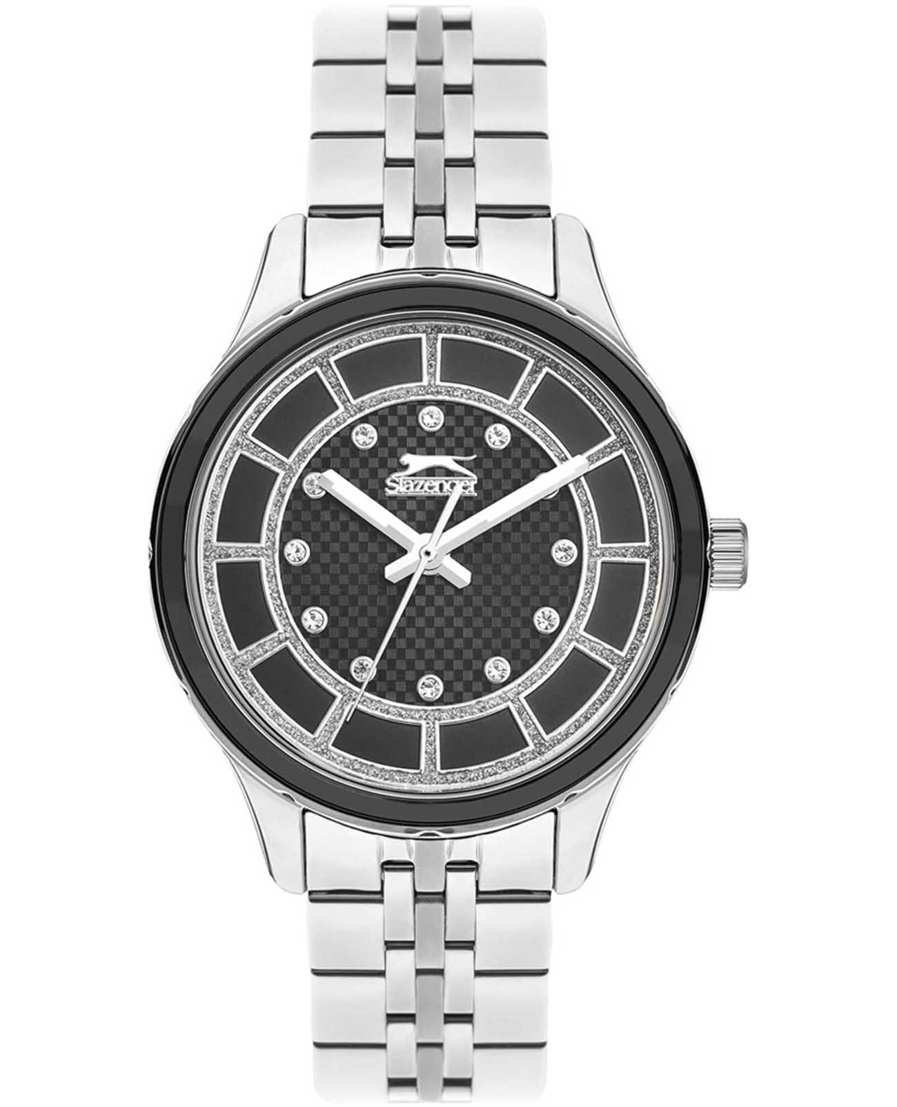 Женские наручные часы Slazenger SL.09.2295.3.01 — это элегантный аксессуар, который подчеркнет утончённый стиль своей обладательницы. Корпус диаметром 36 мм и толщиной 11,5 мм выполнен из прочного металла и надёжно защищён минеральным стекломМинеральное стеклоМинеральное стекло представляет собой искусственно выращенный минерал кварца. Такое стекло отличается особой устойчивостью к повреждениям и царапинам. Уступает по некоторым качествам сапфировому стеклу., устойчивым к царапинам. Черный циферблат украшен изящными кристаллами, придающими часам особый блеск и изысканность. Модель оснащена люминесцентным покрытиемЛюминесцентное покрытиеПозволяет считывать показания времени в темноте. Производители наносят на стрелки, часовые индексы, безель или поверхность циферблата светонакопительный состав, дающий холодное свечение. стрелок, что облегчает считывание времени в темноте. Особое внимание привлекает безельБезельВнешний ободок, закрепляющий стекло. В спортивных часах так называется поворотное кольцо с делениями на циферблате, выполняет роль таймера – замеряет отрезки времени на шкале. Неподвижный безель – элемент декора. Однонаправленно вращающийся безель на дайверских часах позволяет фиксировать моменты погружения и выныривания на поверхность. с черным IP-покрытиемIP-покрытиеМетод ионного напыления. Демонстрирует повышенную устойчивость к истиранию, окислению и химическим веществам. Под воздействием высокого давления и температуры около 1500°C молекулы металла надёжно соединяются с частицами корпуса часов.. Серебристый металлический браслет шириной 16 мм оснащён удобной раскладной застёжкойРаскладная застёжкаТакой тип застёжки используется только на браслетах из металла. Она никогда не раскрывается полностью, происходит разделение на 2 и более частей. Раскладывающая застёжка снизит вероятность потери часов к минимуму. для комфортной посадки на запястье. Кварцевый механизм обеспечивает точность хода, а водозащита уровня WR 30 защищает часы от случайных брызг. Для удобства в условиях плохой освещённости предусмотрена подсветка стрелок. Вес изделия составляет 95 граммов.