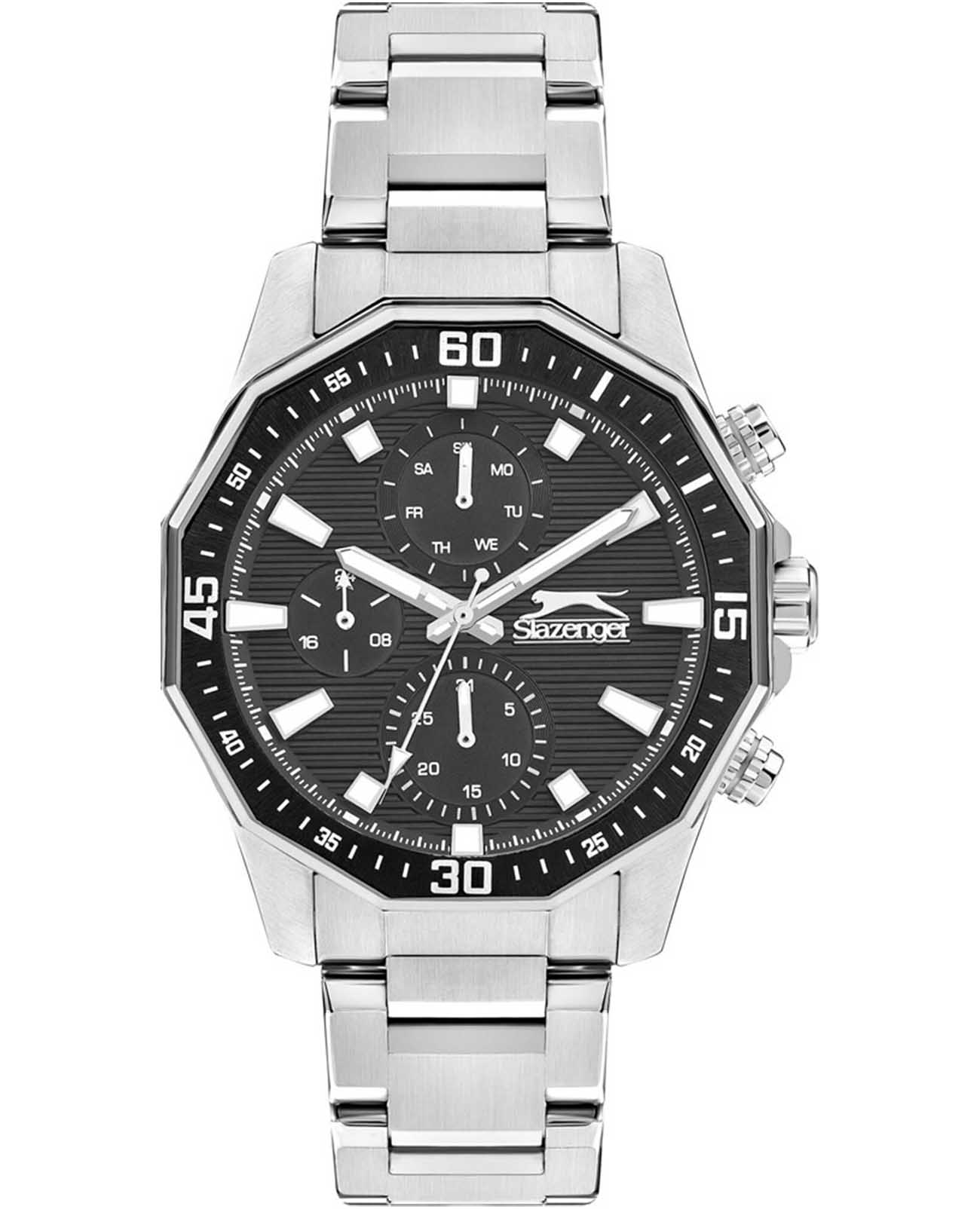 Стильные наручные часы Slazenger SL.09.2297.2.05 созданы для ценителей надежности и современного дизайна. Классический металлический корпус и серебристый браслет гармонично сочетают элегантность и практичность. Кварцевый механизм обеспечивает точность хода, а минеральное стеклоМинеральное стеклоМинеральное стекло представляет собой искусственно выращенный минерал кварца. Такое стекло отличается особой устойчивостью к повреждениям и царапинам. Уступает по некоторым качествам сапфировому стеклу. защищает циферблат от царапин. Особое внимание привлекает безельБезельВнешний ободок, закрепляющий стекло. В спортивных часах так называется поворотное кольцо с делениями на циферблате, выполняет роль таймера – замеряет отрезки времени на шкале. Неподвижный безель – элемент декора. Однонаправленно вращающийся безель на дайверских часах позволяет фиксировать моменты погружения и выныривания на поверхность. с черным IP-покрытиемIP-покрытиеМетод ионного напыления. Демонстрирует повышенную устойчивость к истиранию, окислению и химическим веществам. Под воздействием высокого давления и температуры около 1500°C молекулы металла надёжно соединяются с частицами корпуса часов.. На дополнительных малых циферблатах отображаются день недели, число и текущее время в 24-часовом формате. Модель оснащена люминесцентным покрытиемЛюминесцентное покрытиеПозволяет считывать показания времени в темноте. Производители наносят на стрелки, часовые индексы, безель или поверхность циферблата светонакопительный состав, дающий холодное свечение. стрелок и меток, что облегчает считывание времени в темноте. Водозащита 50 метров позволяет не снимать часы во время дождя или мытья рук. Заводная головка оснащена защитой, а задняя крышка завинчивается для дополнительной безопасности. Браслет снабжен удобной раскладной застёжкойРаскладная застёжкаТакой тип застёжки используется только на браслетах из металла. Она никогда не раскрывается полностью, происходит разделение на 2 и более частей. Раскладывающая застёжка снизит вероятность потери часов к минимуму.. Диаметр корпуса составляет 43 мм, толщина — 13 мм, ширина ремешка 22 мм, а вес часов — 167 грамм.
