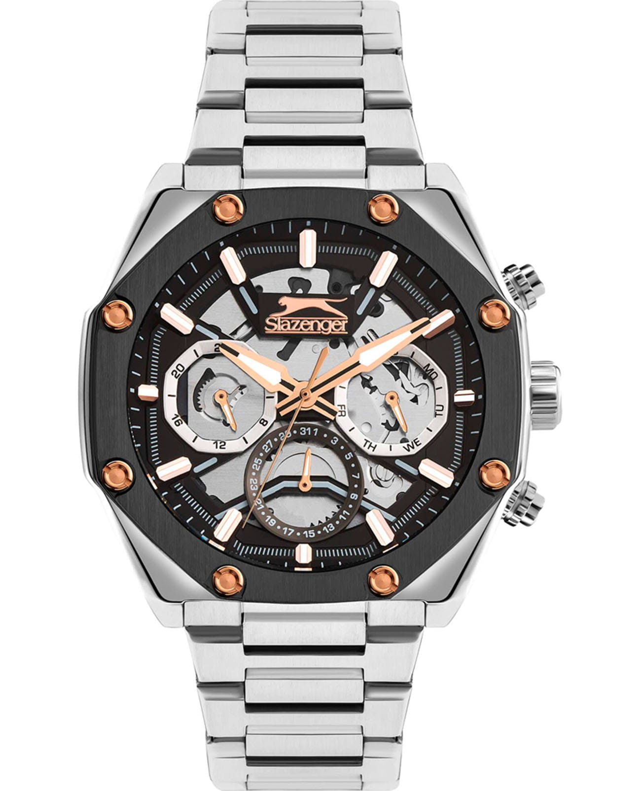 Мужские кварцевые часы Slazenger SL.09.2318.2.03 - это выразительный и функциональный аксессуар, сочетающий стиль, технологичность и насыщенную комплектацию. Корпус и браслет выполнены из суперметалла. БезельБезельВнешний ободок, закрепляющий стекло. В спортивных часах так называется поворотное кольцо с делениями на циферблате, выполняет роль таймера – замеряет отрезки времени на шкале. Неподвижный безель – элемент декора. Однонаправленно вращающийся безель на дайверских часах позволяет фиксировать моменты погружения и выныривания на поверхность. с IP-покрытиемIP-покрытиеМетод ионного напыления. Демонстрирует повышенную устойчивость к истиранию, окислению и химическим веществам. Под воздействием высокого давления и температуры около 1500°C молекулы металла надёжно соединяются с частицами корпуса часов.. Циферблат защищён минеральным стекломМинеральное стеклоМинеральное стекло представляет собой искусственно выращенный минерал кварца. Такое стекло отличается особой устойчивостью к повреждениям и царапинам. Уступает по некоторым качествам сапфировому стеклу. и частично скелетонизирован, что позволяет наблюдать за работой механизма, и дополнен вынесенными малыми циферблатами для индикации дня недели, даты и времени в 24-часовом формате. Стрелки и метки оснащены люминесцентным покрытиемЛюминесцентное покрытиеПозволяет считывать показания времени в темноте. Производители наносят на стрелки, часовые индексы, безель или поверхность циферблата светонакопительный состав, дающий холодное свечение., обеспечивающим хорошую читаемость в темноте. Браслет из суперметалла фиксируется на раскладной застёжкеРаскладная застёжкаТакой тип застёжки используется только на браслетах из металла. Она никогда не раскрывается полностью, происходит разделение на 2 и более частей. Раскладывающая застёжка снизит вероятность потери часов к минимуму., обеспечивая удобство и надёжность ношения. Водонепроницаемость 50 м позволяет использовать часы в повседневных условиях, защищая от случайных брызг и капель дождя. Модель подчёркивает индивидуальность владельца и идеально подходит как для повседневного, так и для делового образа.