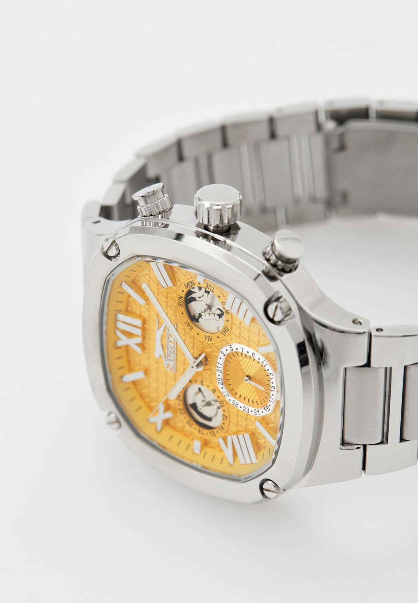 Мужские кварцевые часы Slazenger SL.09.2320.2.06 — это выразительный и функциональный аксессуар, сочетающий стиль, прочность и насыщенную комплектацию. Корпус и браслет выполнены из суперметалла, а циферблат частично оформлен в желтых тонах. Циферблат защищён минеральным стекломМинеральное стеклоМинеральное стекло представляет собой искусственно выращенный минерал кварца. Такое стекло отличается особой устойчивостью к повреждениям и царапинам. Уступает по некоторым качествам сапфировому стеклу. и дополнен вынесенными малыми циферблатами для индикации дня недели, даты и времени в 24-часовом формате. Стрелки и метки оснащены люминесцентным покрытиемЛюминесцентное покрытиеПозволяет считывать показания времени в темноте. Производители наносят на стрелки, часовые индексы, безель или поверхность циферблата светонакопительный состав, дающий холодное свечение., обеспечивающим хорошую читаемость в темноте. Браслет из суперметалла фиксируется на раскладной застёжкеРаскладная застёжкаТакой тип застёжки используется только на браслетах из металла. Она никогда не раскрывается полностью, происходит разделение на 2 и более частей. Раскладывающая застёжка снизит вероятность потери часов к минимуму., обеспечивая удобство и безопасность ношения. Водонепроницаемость 50 м позволяет использовать часы в повседневных условиях, защищая от случайных брызг и капель дождя. Модель подчёркивает индивидуальность владельца и идеально подходит как для повседневного, так и для делового образа.