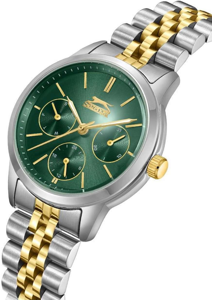 Женские элегантные наручные часы Slazenger SL.09.2336.4.04 сочетают в себе современный стиль и функциональность. Корпус выполнен из суперметалла , придающий модели дополнительную прочность и элегантный внешний вид. Изысканный циферблат защищён минеральным стекломМинеральное стеклоМинеральное стекло представляет собой искусственно выращенный минерал кварца. Такое стекло отличается особой устойчивостью к повреждениям и царапинам. Уступает по некоторым качествам сапфировому стеклу., устойчивым к царапинам и повреждениям. Водонепроницаемость 3 АТМ позволяет использовать часы в повседневных условиях — при мытье рук или под лёгким дождём. Часы оснащены дополнительными циферблатами, отображающими дату, день недели и 24-часовой формат времени, что добавляет практичности в повседневном использовании. Браслет из суперметалла с IP-покрытиемIP-покрытиеМетод ионного напыления. Демонстрирует повышенную устойчивость к истиранию, окислению и химическим веществам. Под воздействием высокого давления и температуры около 1500°C молекулы металла надёжно соединяются с частицами корпуса часов. и с раскладной застёжкойРаскладная застёжкаТакой тип застёжки используется только на браслетах из металла. Она никогда не раскрывается полностью, происходит разделение на 2 и более частей. Раскладывающая застёжка снизит вероятность потери часов к минимуму. обеспечивает надёжную фиксацию и комфорт при ношении. Эта модель идеально подходит для женщин, ценящих стиль, функциональность и надёжность в одном аксессуаре.