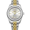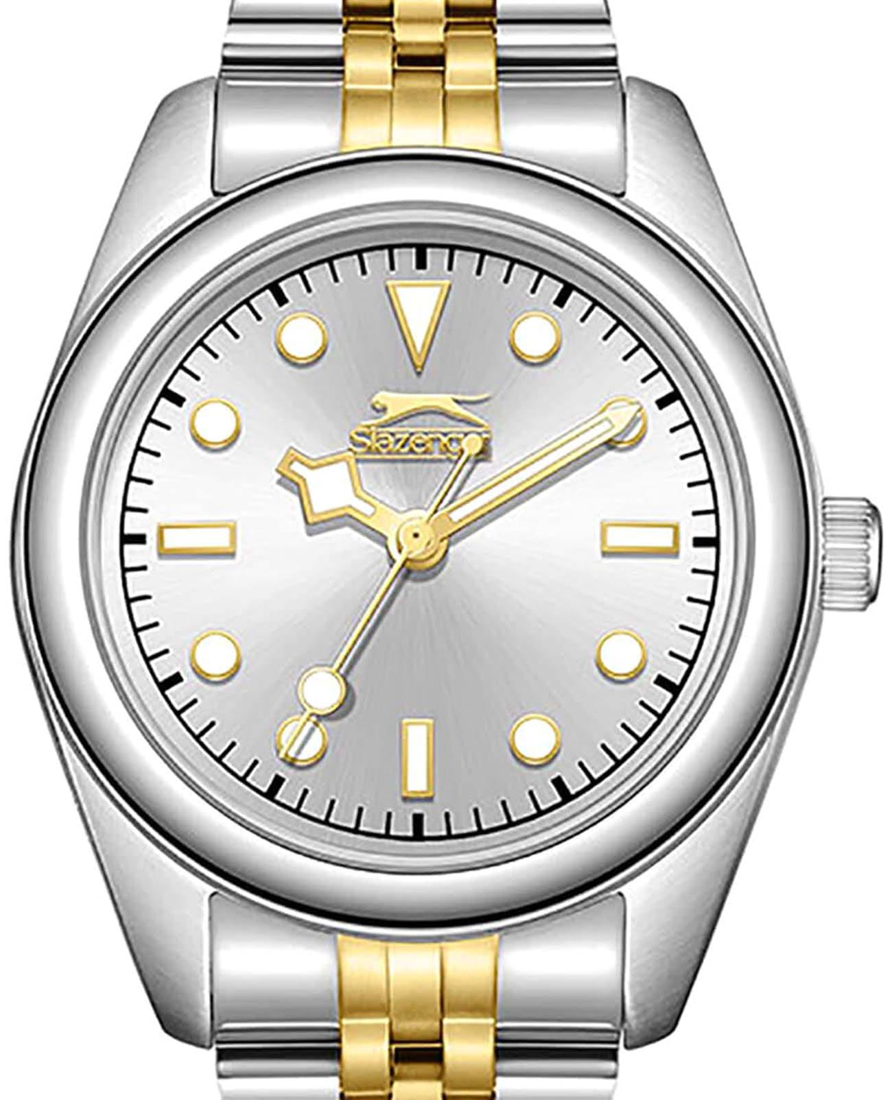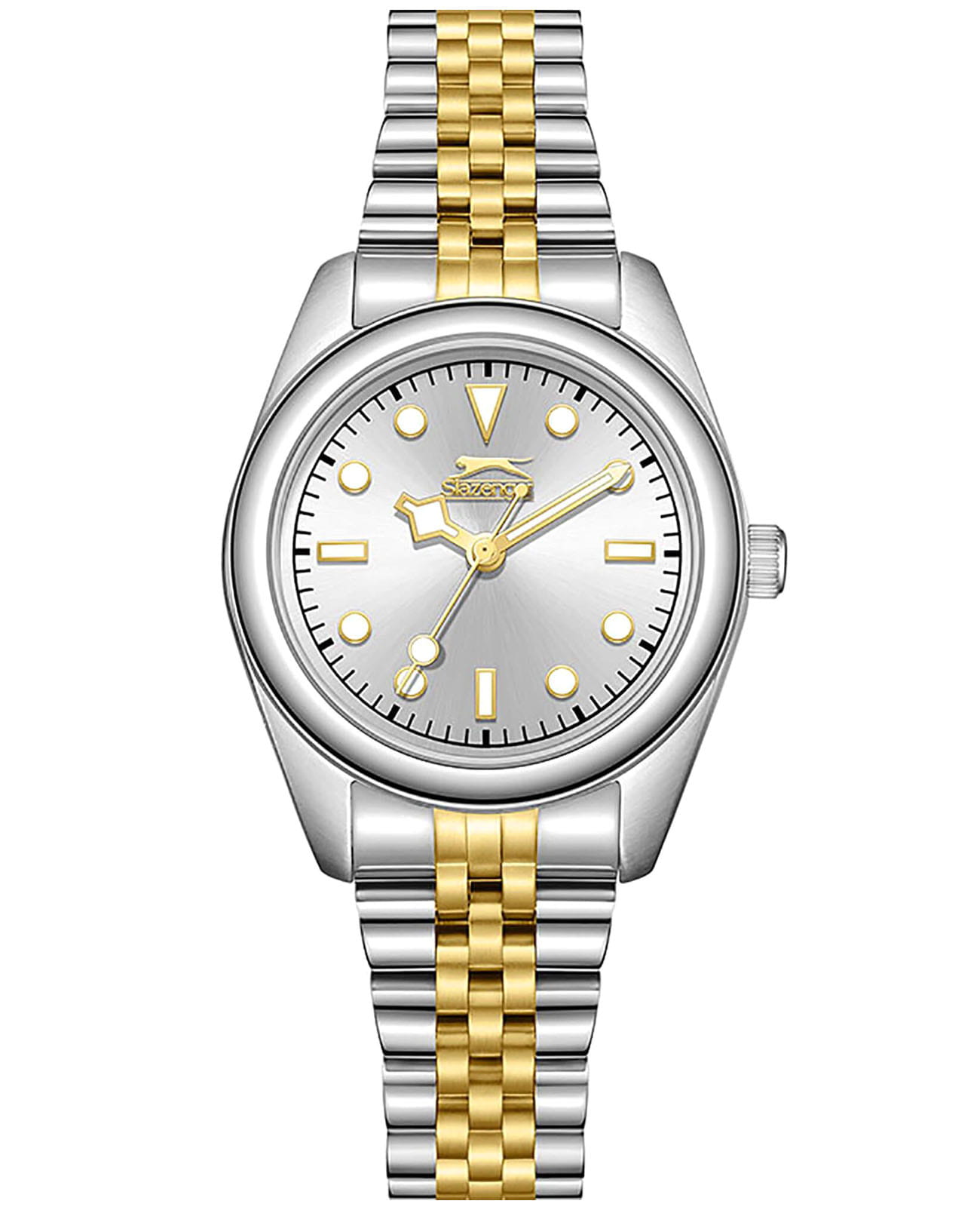 Женские кварцевые часы Slazenger SL.09.2355.3.04 – это сочетание элегантности, современного стиля и надёжности. Изящный корпус из суперметалла серебристого цвета, диаметром 31 мм и толщиной 10 мм, подчёркивает утончённость модели и делает их идеальным аксессуаром для любой ситуации – будь то деловая встреча, романтический вечер или повседневные выходы. Циферблат надёжно защищён минеральным стекломМинеральное стеклоМинеральное стекло представляет собой искусственно выращенный минерал кварца. Такое стекло отличается особой устойчивостью к повреждениям и царапинам. Уступает по некоторым качествам сапфировому стеклу., которое устойчиво к механическим повреждениям и сохраняет кристальную прозрачность. Браслет из суперметалла с IP-покрытиемIP-покрытиеМетод ионного напыления. Демонстрирует повышенную устойчивость к истиранию, окислению и химическим веществам. Под воздействием высокого давления и температуры около 1500°C молекулы металла надёжно соединяются с частицами корпуса часов. золотистого цвета удобно облегает запястье и фиксируется с помощью раскладной застёжкиРаскладная застёжкаТакой тип застёжки используется только на браслетах из металла. Она никогда не раскрывается полностью, происходит разделение на 2 и более частей. Раскладывающая застёжка снизит вероятность потери часов к минимуму., обеспечивая надёжность и комфорт в повседневном ношении. Утончённый стиль, внимание к деталям и практичность делают эту модель идеальным выбором для современных женщин, ценящих эстетику и функциональность. Стрелки и метки покрыты люминесцентным покрытиемЛюминесцентное покрытиеПозволяет считывать показания времени в темноте. Производители наносят на стрелки, часовые индексы, безель или поверхность циферблата светонакопительный состав, дающий холодное свечение., обеспечивающим отличную читаемость в темноте. Водозащита до 30 метров позволит защитить корпус от случайных брызг или капель дождя.