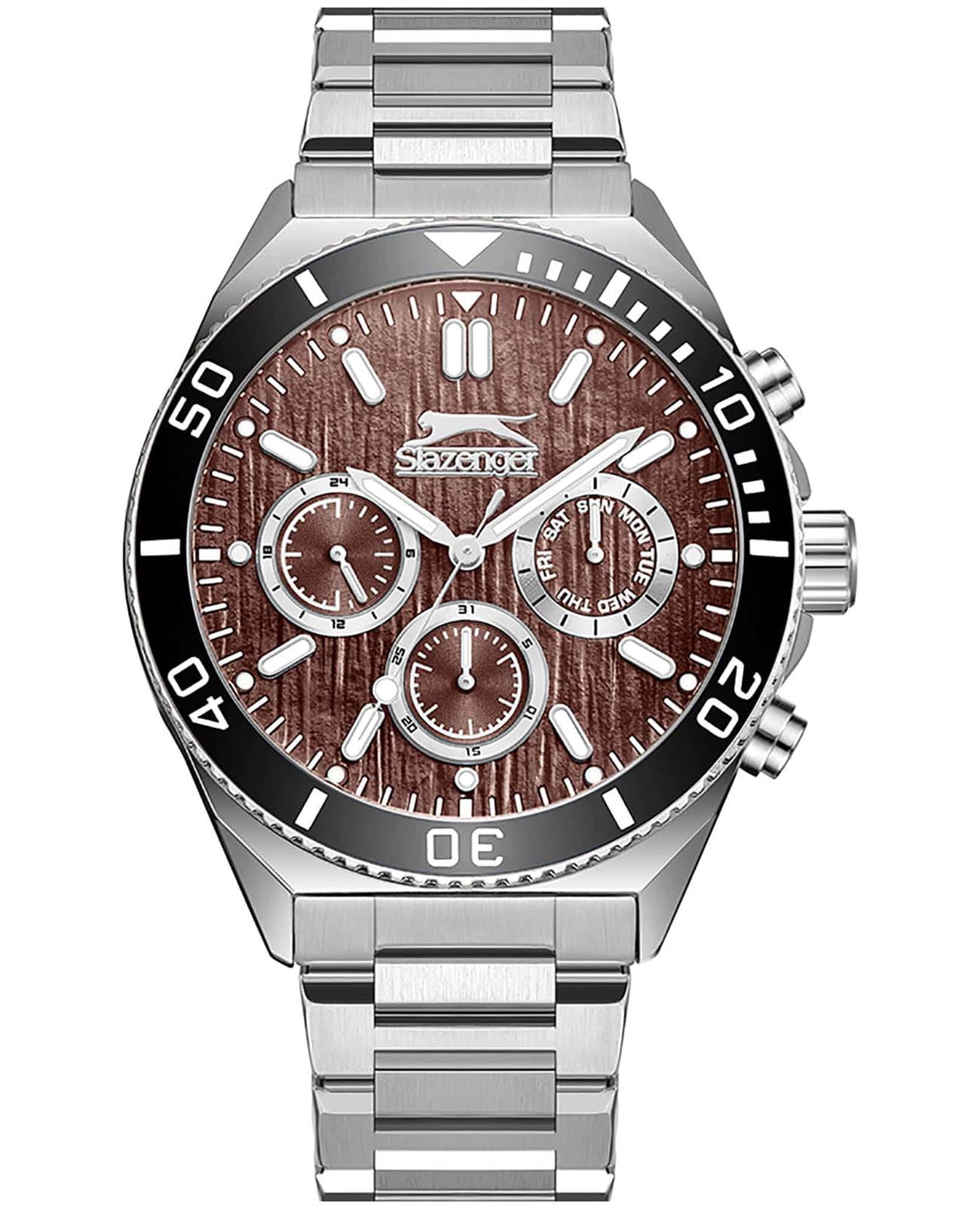 Мужские кварцевые часы Slazenger SL.09.2370.2.06 – идеальное сочетание классического дизайна и современных технологий, созданное для уверенных в себе мужчин. Корпус выполнен из суперметалла серебристого цвета, диаметром 44.5 мм и толщиной 13 мм, подчёркивает надежность модели и делает их идеальным аксессуаром для любой ситуации – будь то деловая встреча или повседневные выходы. Циферблат надёжно защищён минеральным стекломМинеральное стеклоМинеральное стекло представляет собой искусственно выращенный минерал кварца. Такое стекло отличается особой устойчивостью к повреждениям и царапинам. Уступает по некоторым качествам сапфировому стеклу., которое устойчиво к механическим повреждениям и сохраняет кристальную прозрачность. БезельБезельВнешний ободок, закрепляющий стекло. В спортивных часах так называется поворотное кольцо с делениями на циферблате, выполняет роль таймера – замеряет отрезки времени на шкале. Неподвижный безель – элемент декора. Однонаправленно вращающийся безель на дайверских часах позволяет фиксировать моменты погружения и выныривания на поверхность. с IP-покрытиемIP-покрытиеМетод ионного напыления. Демонстрирует повышенную устойчивость к истиранию, окислению и химическим веществам. Под воздействием высокого давления и температуры около 1500°C молекулы металла надёжно соединяются с частицами корпуса часов. черного цвета. Стальной браслет удобно облегает запястье и фиксируется с помощью раскладной застёжкиРаскладная застёжкаТакой тип застёжки используется только на браслетах из металла. Она никогда не раскрывается полностью, происходит разделение на 2 и более частей. Раскладывающая застёжка снизит вероятность потери часов к минимуму., обеспечивая надёжность и комфорт в повседневном ношении. Стрелки и метки покрыты люминесцентным покрытиемЛюминесцентное покрытиеПозволяет считывать показания времени в темноте. Производители наносят на стрелки, часовые индексы, безель или поверхность циферблата светонакопительный состав, дающий холодное свечение., обеспечивающим отличную читаемость в темноте. Эти часы станут не просто аксессуаром, а надежным спутником в любой ситуации, подчеркивая ваш безупречный вкус и деловой стиль. Вынесенный циферблат с 24-х часовым указателем времени. Водозащита 50 метров позволит защитить корпус от случайных брызг или капель дождя.