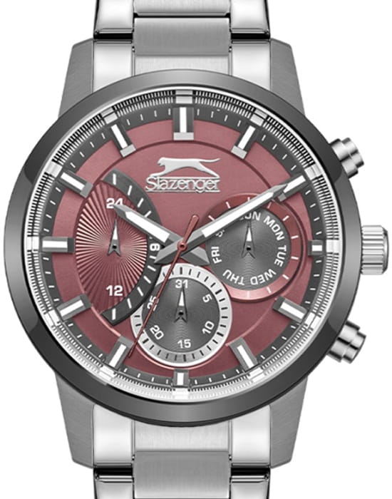 Slazenger (SL.09.2372.2.06) — стильные мужские часы, сочетающие современный дизайн и функциональность. Корпус выполнен из суперметалла, придающей модели прочность и долговечность. Минеральное стеклоМинеральное стеклоМинеральное стекло представляет собой искусственно выращенный минерал кварца. Такое стекло отличается особой устойчивостью к повреждениям и царапинам. Уступает по некоторым качествам сапфировому стеклу. защищает циферблат от царапин и гарантирует превосходную читаемость. БезельБезельВнешний ободок, закрепляющий стекло. В спортивных часах так называется поворотное кольцо с делениями на циферблате, выполняет роль таймера – замеряет отрезки времени на шкале. Неподвижный безель – элемент декора. Однонаправленно вращающийся безель на дайверских часах позволяет фиксировать моменты погружения и выныривания на поверхность. с PVD-покрытиемPVDУльтратонкое покрытие наносится в технике вакуумного напыления, сочетает в себе нитрид титана особой прочности со слоем золота или оксида хрома. Несёт в себе декоративную или защитную функцию.. Циферблат с серебристыми метками и стрелками подчёркивает элегантный стиль. Браслет из суперметалла обеспечивает комфортное ношение и надёжную фиксацию на запястье. Функциональность дополняется многофункциональным дисплеем с индикацией даты, дня недели и 24-часового формата времени. Водонепроницаемость 50 метров делает модель устойчивой к случайным брызгам, идеально подходя для повседневного использования.