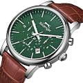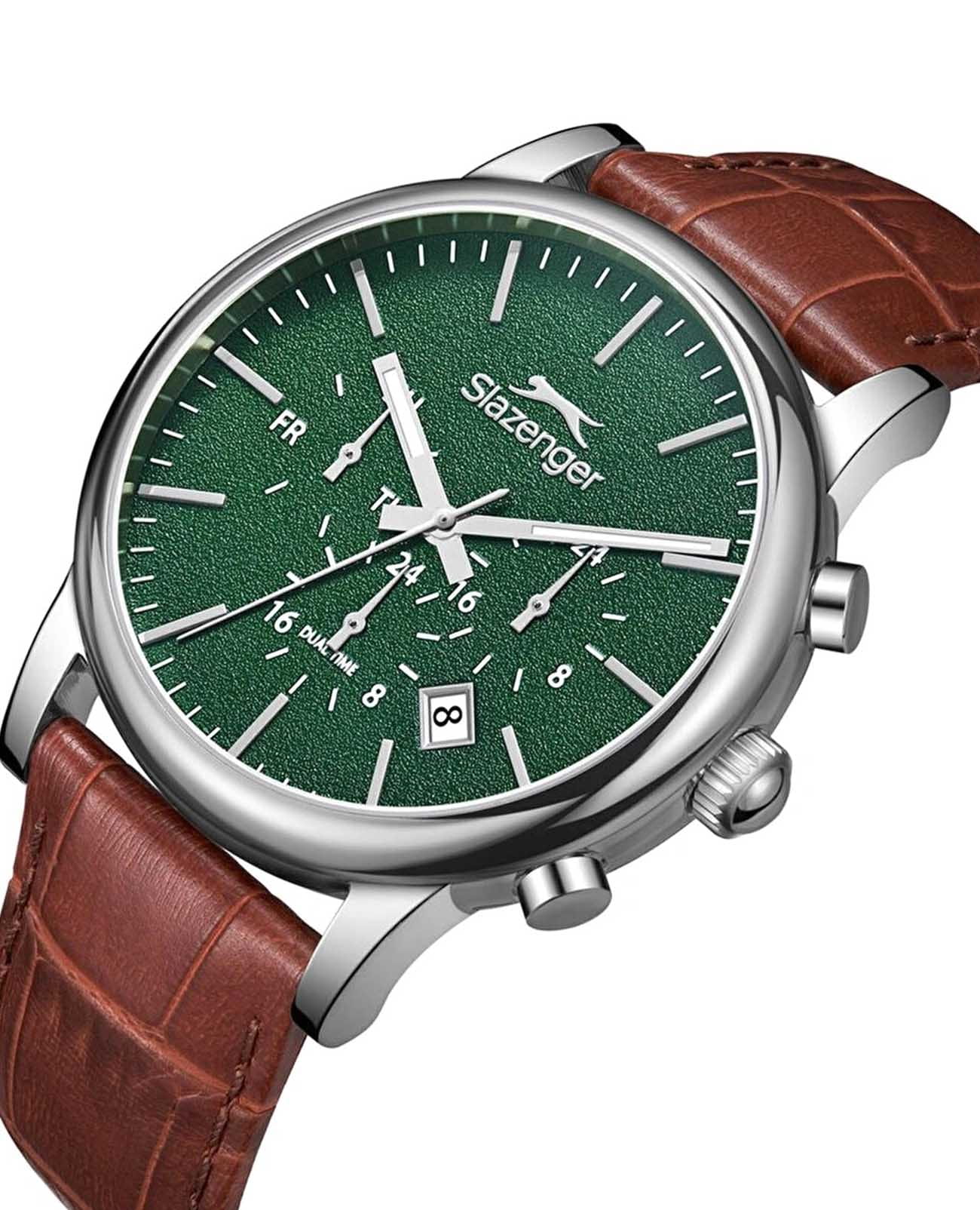 Мужские кварцевые часы Slazenger — это выразительный и функциональный аксессуар. Корпус диаметром 43 мм и толщиной 12 мм выполнен из нержавеющей стали 316L. Циферблат зелёного цвета оформлен индексами и стрелками. Циферблат защищён минеральным стекломМинеральное стеклоМинеральное стекло представляет собой искусственно выращенный минерал кварца. Такое стекло отличается особой устойчивостью к повреждениям и царапинам. Уступает по некоторым качествам сапфировому стеклу.. Механизм — кварцевый. Часы оснащены индикацией дня недели, даты, 12/24-часового формата времени и функцией второго часового пояса (GMT)Второй часовой поясФункция, позволяющая отображать время двух часовых поясов одновременно.. Окошко даты расположено между 4 и 5 часами. Стрелки с люминесцентным покрытиемЛюминесцентное покрытиеПозволяет считывать показания времени в темноте. Производители наносят на стрелки, часовые индексы, безель или поверхность циферблата светонакопительный состав, дающий холодное свечение., обеспечивающим хорошую читаемость в темноте. Часы оснащены кожаным ремешком со стандартной застёжкой. Водонепроницаемость 100 м позволяет использовать часы для плавания и повседневного ношения. Гарантия — 12 месяцев. Идеальный выбор для тех, кто ценит стиль, функциональность и качество.
