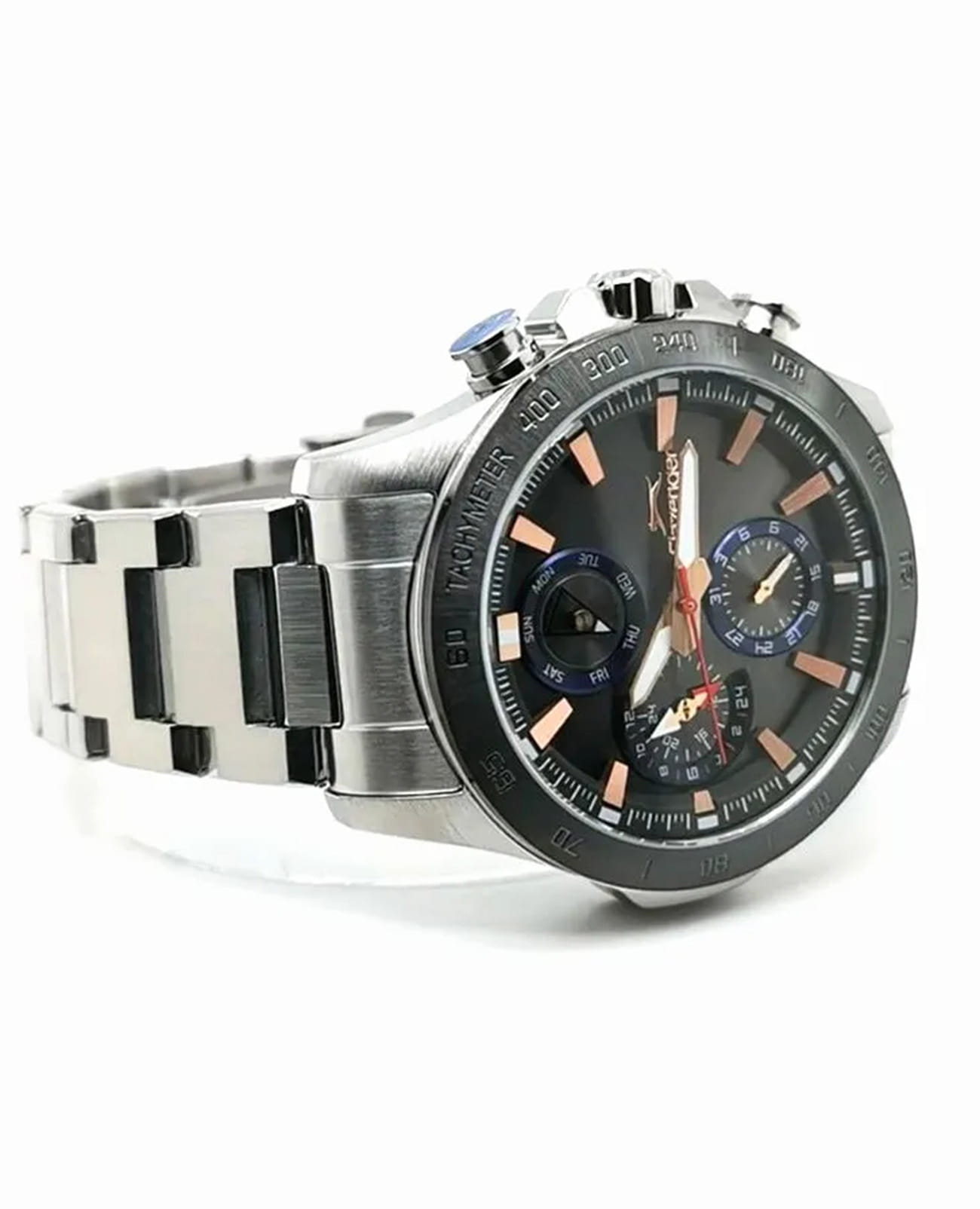 Мужские кварцевые часы Slazenger — это выразительный и функциональный аксессуар. Корпус диаметром 44 мм и толщиной 12 мм выполнен из нержавеющей стали 316L. БезельБезельВнешний ободок, закрепляющий стекло. В спортивных часах так называется поворотное кольцо с делениями на циферблате, выполняет роль таймера – замеряет отрезки времени на шкале. Неподвижный безель – элемент декора. Однонаправленно вращающийся безель на дайверских часах позволяет фиксировать моменты погружения и выныривания на поверхность. с IP-покрытиемIP-покрытиеМетод ионного напыления. Демонстрирует повышенную устойчивость к истиранию, окислению и химическим веществам. Под воздействием высокого давления и температуры около 1500°C молекулы металла надёжно соединяются с частицами корпуса часов.. Циферблат чёрного цвета оформлен индексами и стрелками. Циферблат защищён минеральным стекломМинеральное стеклоМинеральное стекло представляет собой искусственно выращенный минерал кварца. Такое стекло отличается особой устойчивостью к повреждениям и царапинам. Уступает по некоторым качествам сапфировому стеклу.. Механизм — кварцевый. Часы оснащены индикацией дня недели, даты и 12/24-часового формата времени. Стрелки и метки с люминесцентным покрытиемЛюминесцентное покрытиеПозволяет считывать показания времени в темноте. Производители наносят на стрелки, часовые индексы, безель или поверхность циферблата светонакопительный состав, дающий холодное свечение., обеспечивающим хорошую читаемость в темноте. Часы оснащены стальным браслетом с раскладной застёжкойРаскладная застёжкаТакой тип застёжки используется только на браслетах из металла. Она никогда не раскрывается полностью, происходит разделение на 2 и более частей. Раскладывающая застёжка снизит вероятность потери часов к минимуму.. Водонепроницаемость 100 м позволяет использовать часы для плавания и повседневного ношения. Гарантия — 12 месяцев. Идеальный выбор для тех, кто ценит стиль, функциональность и качество.