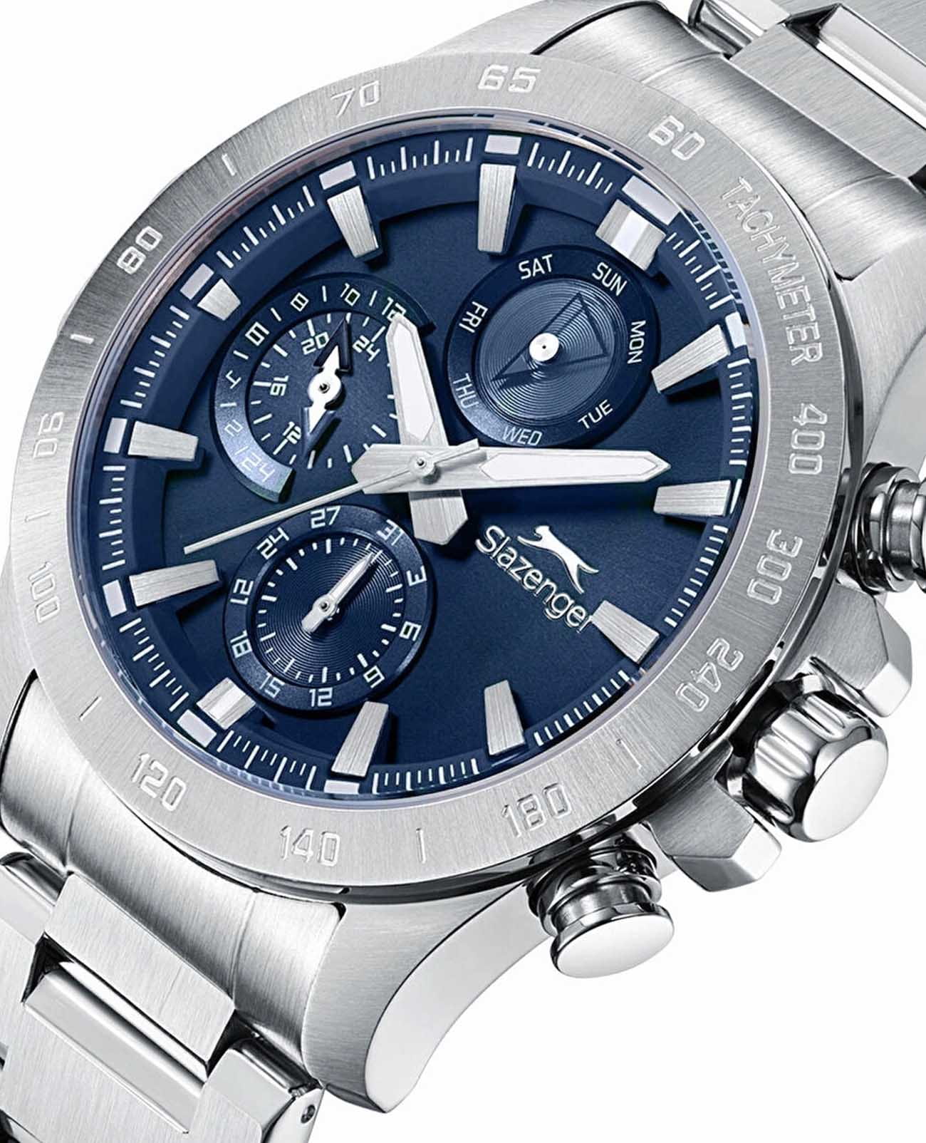 Мужские кварцевые часы Slazenger — это выразительный и функциональный аксессуар. Корпус диаметром 44 мм и толщиной 12 мм выполнен из нержавеющей стали 316L. Циферблат синего цвета оформлен индексами и стрелками. Циферблат защищён минеральным стекломМинеральное стеклоМинеральное стекло представляет собой искусственно выращенный минерал кварца. Такое стекло отличается особой устойчивостью к повреждениям и царапинам. Уступает по некоторым качествам сапфировому стеклу.. Механизм — кварцевый. Часы оснащены индикацией дня недели, даты и 12/24-часового формата времени. Стрелки и метки с люминесцентным покрытиемЛюминесцентное покрытиеПозволяет считывать показания времени в темноте. Производители наносят на стрелки, часовые индексы, безель или поверхность циферблата светонакопительный состав, дающий холодное свечение., обеспечивающим хорошую читаемость в темноте. Часы оснащены стальным браслетом с раскладной застёжкойРаскладная застёжкаТакой тип застёжки используется только на браслетах из металла. Она никогда не раскрывается полностью, происходит разделение на 2 и более частей. Раскладывающая застёжка снизит вероятность потери часов к минимуму.. Водонепроницаемость 100 м позволяет использовать часы для плавания и повседневного ношения. Гарантия — 12 месяцев. Идеальный выбор для тех, кто ценит стиль, функциональность и качество.