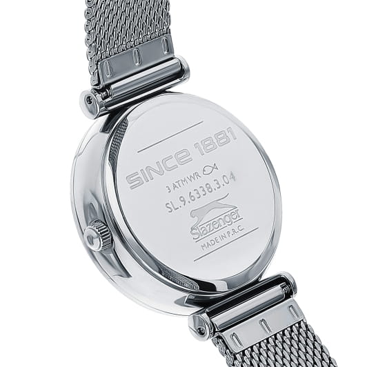 Женские кварцевые часы Slazenger — это элегантный аксессуар. Корпус диаметром 30 мм и толщиной 8 мм выполнен из суперметалла. БезельБезельВнешний ободок, закрепляющий стекло. В спортивных часах так называется поворотное кольцо с делениями на циферблате, выполняет роль таймера – замеряет отрезки времени на шкале. Неподвижный безель – элемент декора. Однонаправленно вращающийся безель на дайверских часах позволяет фиксировать моменты погружения и выныривания на поверхность. с IP-покрытиемIP-покрытиеМетод ионного напыления. Демонстрирует повышенную устойчивость к истиранию, окислению и химическим веществам. Под воздействием высокого давления и температуры около 1500°C молекулы металла надёжно соединяются с частицами корпуса часов.. Циферблат серебристого цвета оформлен индексами, стрелками и украшен фианитами. Циферблат защищён минеральным стекломМинеральное стеклоМинеральное стекло представляет собой искусственно выращенный минерал кварца. Такое стекло отличается особой устойчивостью к повреждениям и царапинам. Уступает по некоторым качествам сапфировому стеклу.. Часы оснащены браслетом миланского плетения из суперметалла на раскладном замкеРаскладная застёжкаТакой тип застёжки используется только на браслетах из металла. Она никогда не раскрывается полностью, происходит разделение на 2 и более частей. Раскладывающая застёжка снизит вероятность потери часов к минимуму.. Водонепроницаемость 30 м позволяет использовать часы в повседневных условиях. Идеальный выбор для тех, кто ценит стиль и качество.