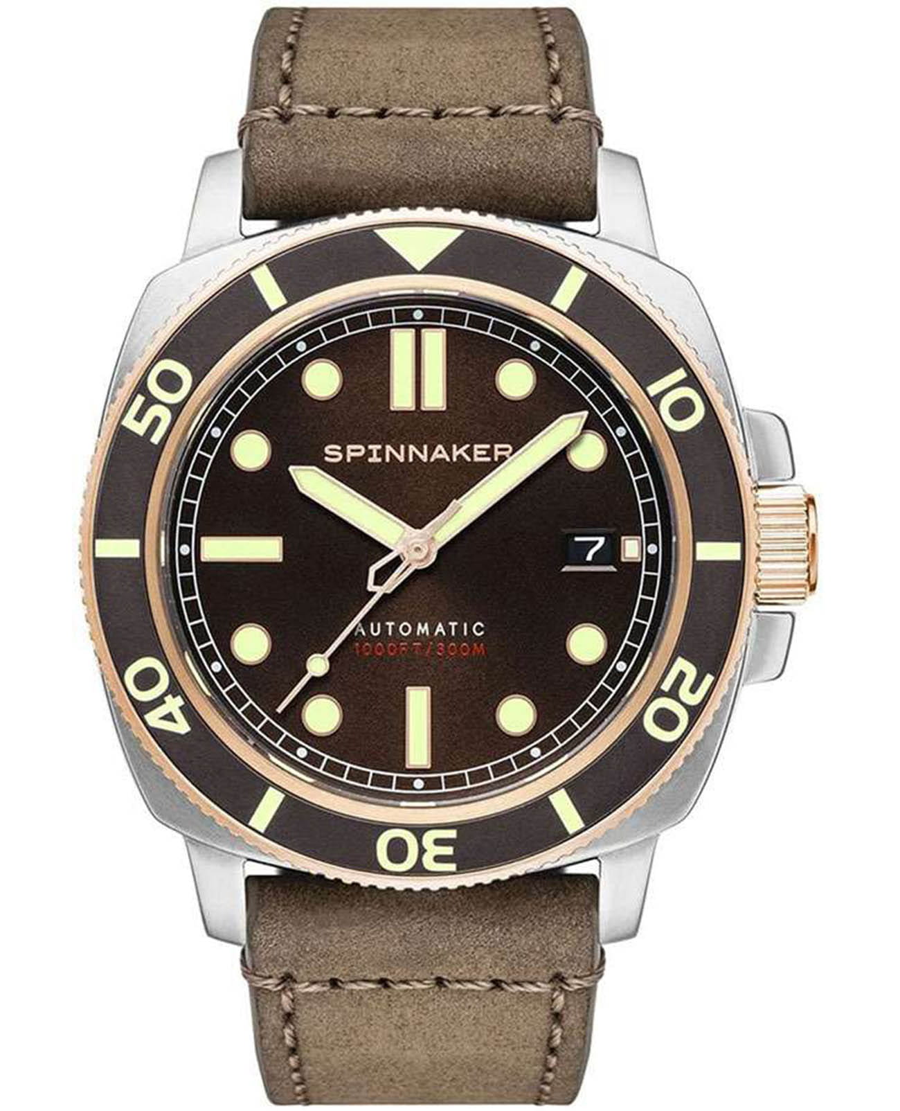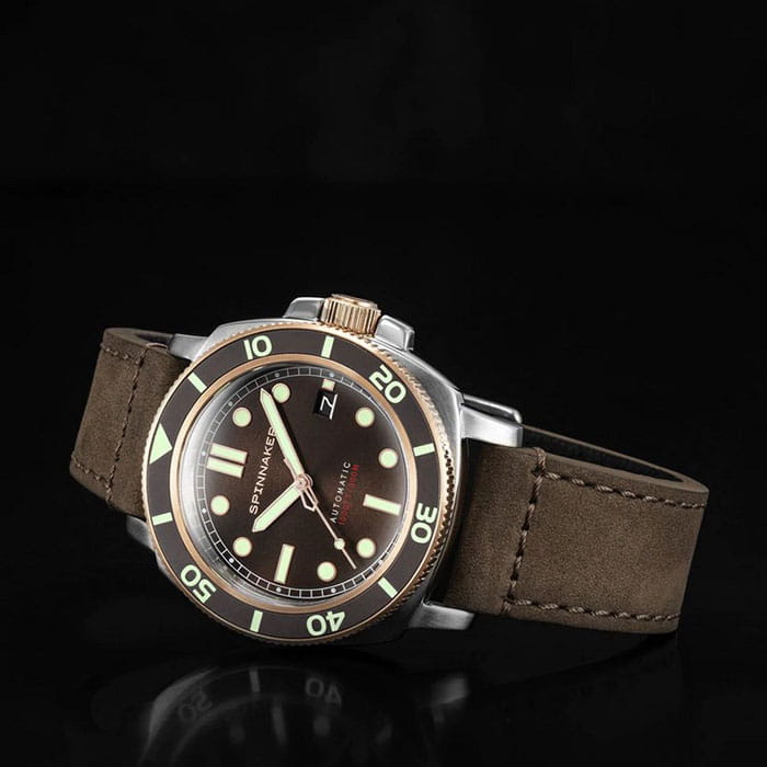 Мужские механические часы с автоподзаводом Spinnaker — это стильный и надёжный аксессуар. Корпус диаметром 42 мм и толщиной 14 мм выполнен из нержавеющей стали 316L. Циферблат коричневого цвета оформлен индексами и стрелками. Стрелки и метки с люминесцентным покрытиемЛюминесцентное покрытиеПозволяет считывать показания времени в темноте. Производители наносят на стрелки, часовые индексы, безель или поверхность циферблата светонакопительный состав, дающий холодное свечение., обеспечивающим хорошую читаемость в темноте. Окошко даты расположено в положении 3 часов. Циферблат защищён сапфировым стекломСапфировое стеклоПрочный и надёжный материал из кристалла сапфира синтетического происхождения, характеризующийся особой твёрдостью и устойчивостью к царапинам и повреждениям.. Механизм — автоматический калибр NH35 (24 камня, частота 21 600 полуколебаний в час) с запасом хода до 40 часов. Однонаправленный безельБезельВнешний ободок, закрепляющий стекло. В спортивных часах так называется поворотное кольцо с делениями на циферблате, выполняет роль таймера – замеряет отрезки времени на шкале. Неподвижный безель – элемент декора. Однонаправленно вращающийся безель на дайверских часах позволяет фиксировать моменты погружения и выныривания на поверхность. с PVD-покрытиемPVDУльтратонкое покрытие наносится в технике вакуумного напыления, сочетает в себе нитрид титана особой прочности со слоем золота или оксида хрома. Несёт в себе декоративную или защитную функцию. обеспечивает точный контроль времени погружения. Часы оснащены коричневым кожаным ремешком шириной 22 мм на классической пряжке. Водонепроницаемость 300 м позволяет использовать часы для плавания и дайвинга. Идеальный выбор для тех, кто ценит качество и универсальный дизайн.