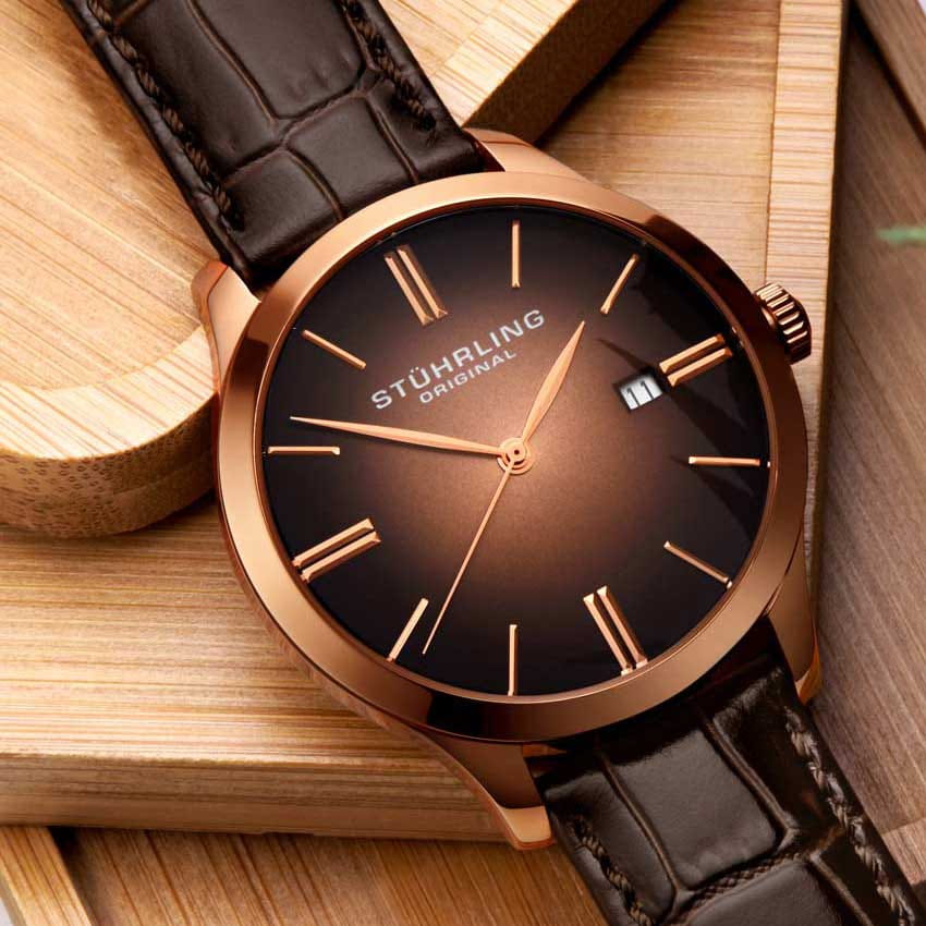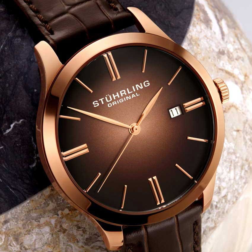 Stuhrling 4014.3 — элегантные мужские часы, объединяющие строгую классику и современную функциональность. Корпус из нержавеющей стали с PVD-покрытиемPVDУльтратонкое покрытие наносится в технике вакуумного напыления, сочетает в себе нитрид титана особой прочности со слоем золота или оксида хрома. Несёт в себе декоративную или защитную функцию. создают ощущение монолитной надёжности, а глубокий циферблат с вертикальной текстурой придаёт модели выразительность и характер. Кожаный ремешок на стандартной застежке обеспечивает комфорт. Крупные метки и стрелки обеспечивают идеальную читаемость. На позиции «3 часов» расположено аккуратное окно даты, подчёркивающее симметрию дизайна. Прочное стекло Krysterna защищает циферблат от царапин, а надёжный кварцевый механизм гарантирует стабильную точность. Stuhrling — выбор уверенного мужчины, ценящего сочетание функциональности, лаконичного дизайна и безупречной отделки.