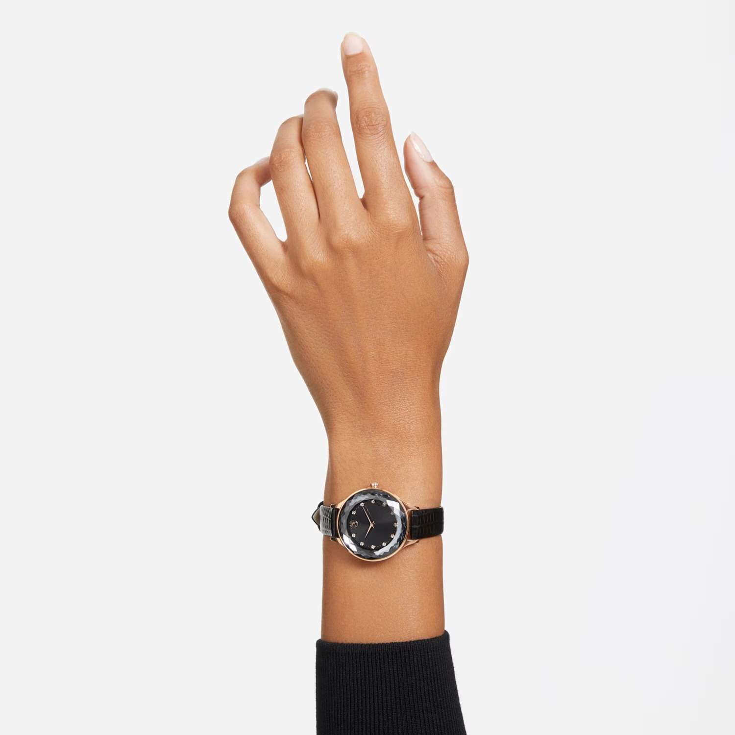 Часы Swarovski 5650033 представляют собой изысканное воплощение швейцарского мастерства и современного дизайна. Эти кварцевые часы выполнены из стали с розовым PVDPVDУльтратонкое покрытие наносится в технике вакуумного напыления, сочетает в себе нитрид титана особой прочности со слоем золота или оксида хрома. Несёт в себе декоративную или защитную функцию.-покрытием, что придает им утонченный и стильный вид. Черный циферблат украшен кристаллами Swarovski и изображением знаменитого лебедя на позиции 12 часов, придавая часам особую изысканность и блеск. Корпус диаметром 33 мм и ремешок из натуральной итальянской телячьей кожи черного цвета с тиснением под кожу ящерицы со стандартной застежкой обеспечивают комфортное ношение и элегантный внешний вид. Сапфировое стеклоСапфировое стеклоПрочный и надёжный материал из кристалла сапфира синтетического происхождения, характеризующийся особой твёрдостью и устойчивостью к царапинам и повреждениям. защищает циферблат от царапин и повреждений, обеспечивая долговечность и надежность изделия. БезельБезельВнешний ободок, закрепляющий стекло. В спортивных часах так называется поворотное кольцо с делениями на циферблате, выполняет роль таймера – замеряет отрезки времени на шкале. Неподвижный безель – элемент декора. Однонаправленно вращающийся безель на дайверских часах позволяет фиксировать моменты погружения и выныривания на поверхность. также сделан из сапфирового стеклаСапфировое стеклоПрочный и надёжный материал из кристалла сапфира синтетического происхождения, характеризующийся особой твёрдостью и устойчивостью к царапинам и повреждениям.. Водозащита 50 WR позволяет не беспокоиться о случайных контактах с водой в повседневной жизни. Клиновидные стрелки в стиле Dauphine и рифленая заводная головка с логотипом Swarovski завершают образ, делая эти часы идеальным аксессуаром для тех, кто ценит качество и стиль в каждом элементе. Эти часы не только функциональны, но и являются настоящим произведением искусства, подчеркивающим ваш изысканный вкус.