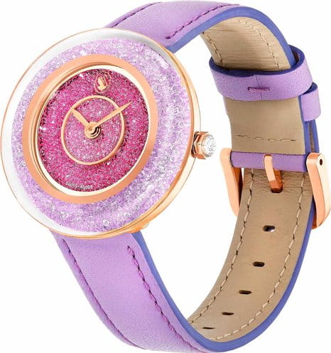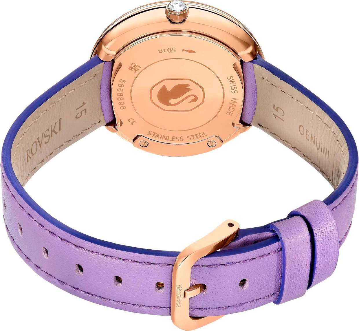 Элегантные швейцарские часы Swarovski 5656896 станут идеальным аксессуаром для тех, кто ценит стиль и изысканность. Эти часы оснащены кварцевым механизмом, что гарантирует точность и надежность в повседневной жизни. Корпус из стали PVDPVDУльтратонкое покрытие наносится в технике вакуумного напыления, сочетает в себе нитрид титана особой прочности со слоем золота или оксида хрома. Несёт в себе декоративную или защитную функцию. покрытием оттенка розового золота имеет классическую круглую форму, а розово-фиолетовый циферблат, лишенный меток, создает смелый и дерзкий образ. Особое внимание привлекают 3460 кристаллов Swarovski розового и фиолетового цвета, которые украшают циферблат, корпус и безельБезельВнешний ободок, закрепляющий стекло. В спортивных часах так называется поворотное кольцо с делениями на циферблате, выполняет роль таймера – замеряет отрезки времени на шкале. Неподвижный безель – элемент декора. Однонаправленно вращающийся безель на дайверских часах позволяет фиксировать моменты погружения и выныривания на поверхность., создавая ослепительный блеск. В положении 12 часов расположился культовый логотип Swarovski в виде лебедя, подчеркивающий уникальность дизайна. Мечевидные стрелки в стиле Sword добавляют элегантности, а граненая заводная головка с кристаллом круглой огранки завершает образ. Ремешок из натуральной итальянской телячьей кожи ярко-фиолетового цвета обеспечивает комфортное ношение и дополняет общий стиль часов. Классическая застежка с логотипом Swarovski гарантирует надежную фиксацию. Сапфировое стеклоСапфировое стеклоПрочный и надёжный материал из кристалла сапфира синтетического происхождения, характеризующийся особой твёрдостью и устойчивостью к царапинам и повреждениям. защищает часы от царапин и других повреждений, а водозащита 50WR позволяет не беспокоиться о случайных попаданиях воды. Диаметр корпуса составляет 33 мм, а длина ремешка — 16,5 см, что делает их идеальными для изящного запястья.